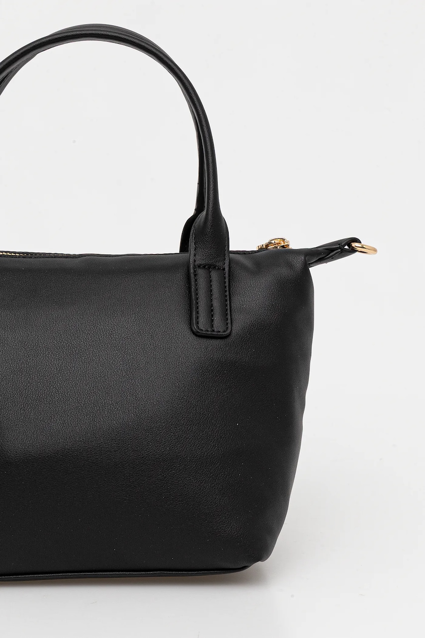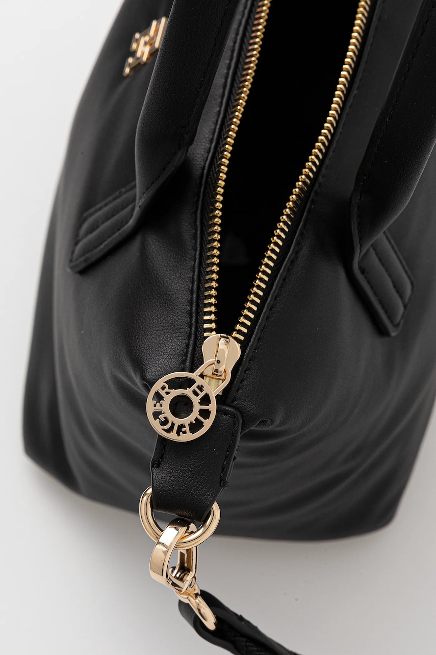 - Zapięcie na suwak. - Kieszonka wewnętrzna zapinana na suwak. - Model z podszewką. - Posiada uchwyty i odpinany pasek z regulacją. - Nie mieści formatu A4. - Głębokość: 14 cm. - Wysokość: 21 cm. - Szerokość u podstawy: 34 cm.
