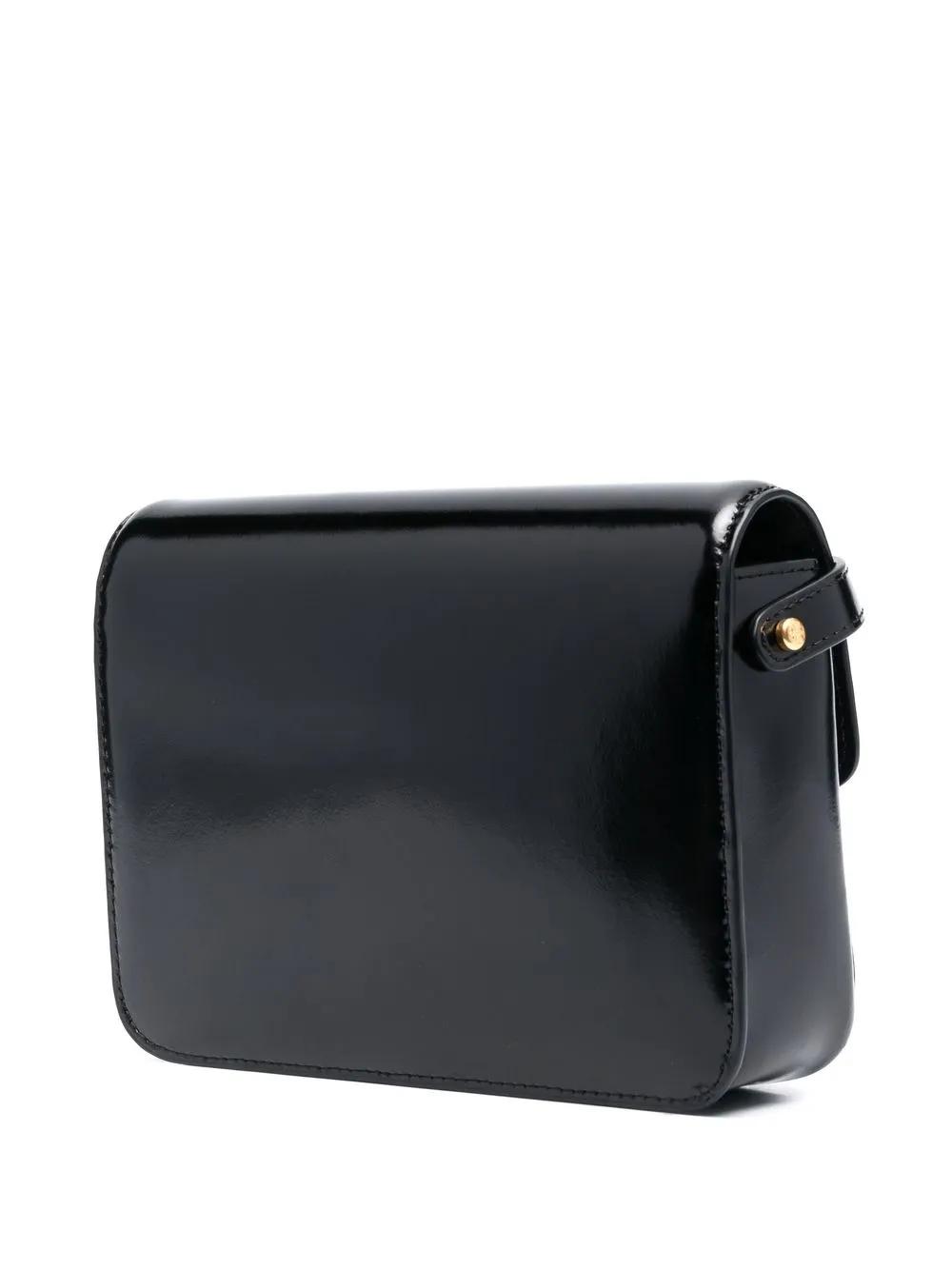 black calf leather gold-tone logo plaque patent finish foldover top with magnetic fastening single shoulder strap main compartment