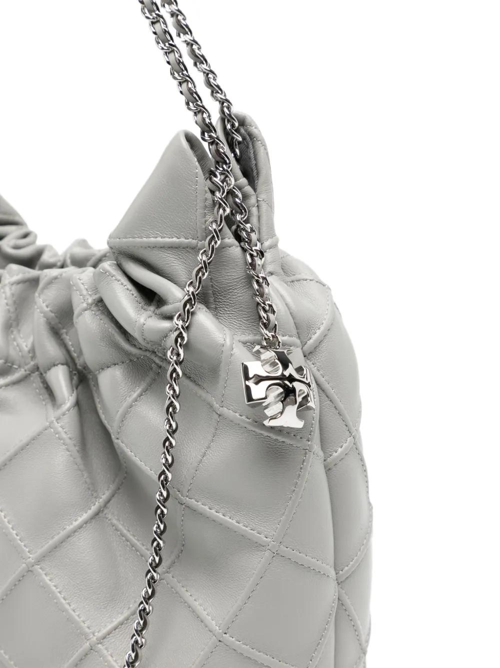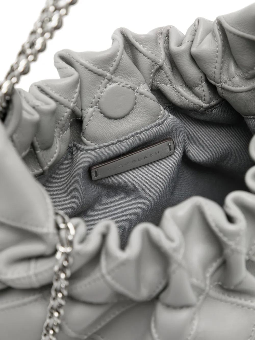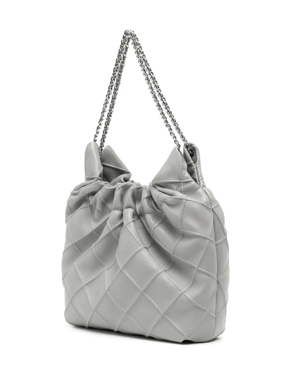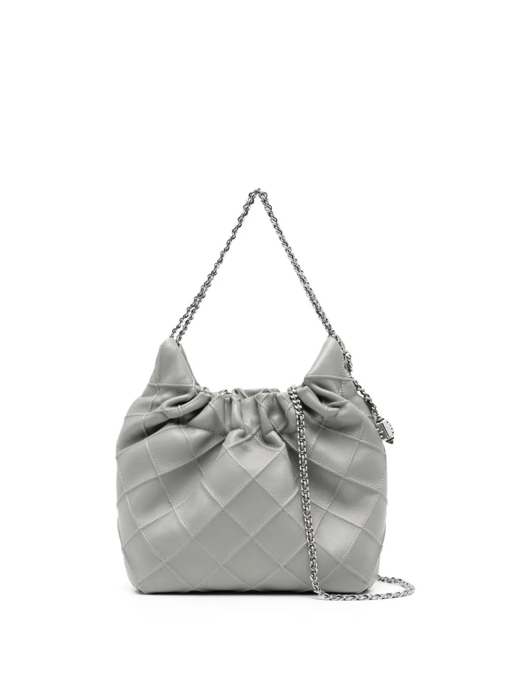 light grey magnetic fastening two leather and chain-link top handles leather and chain-link shoulder strap logo charm