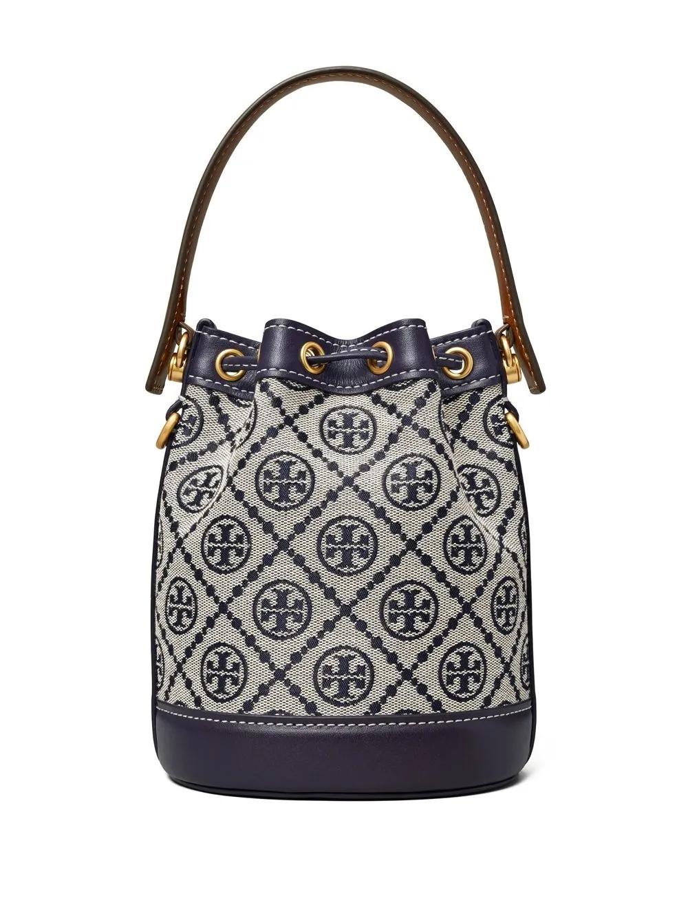 navy blue leather monogram print drawstring fastening single top handle adjustable detachable shoulder strap main compartment