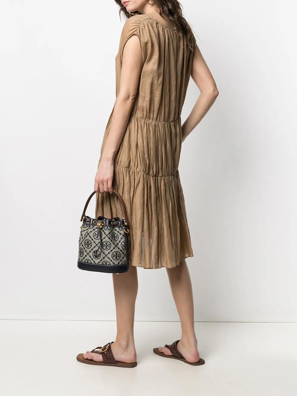 navy-blue/beige/cognac-brown monogram pattern leather trim adjustable detachable shoulder strap single top handle drawstring fastening main compartment metal feet gold-tone hardware