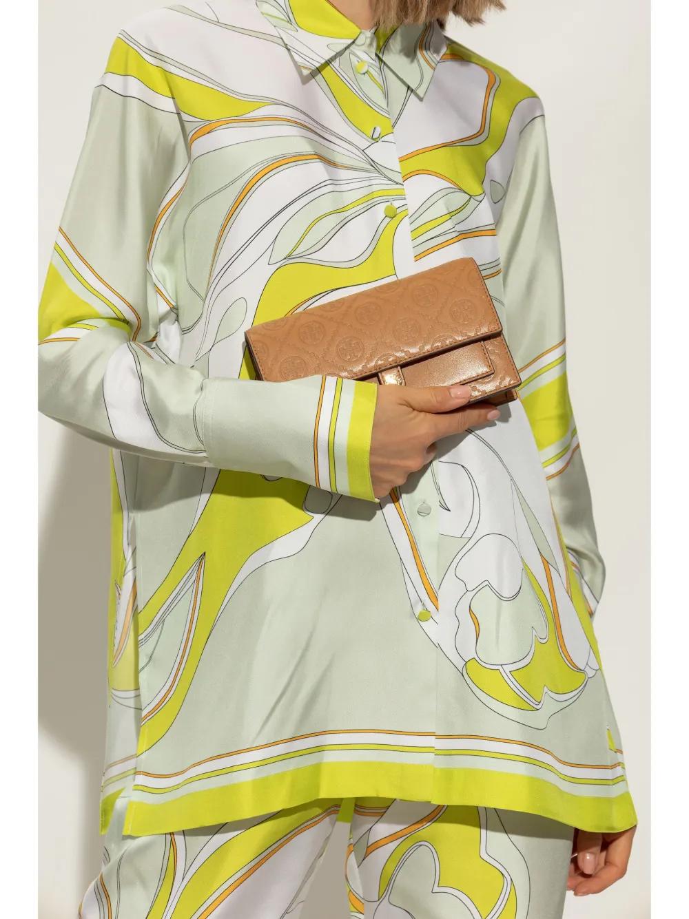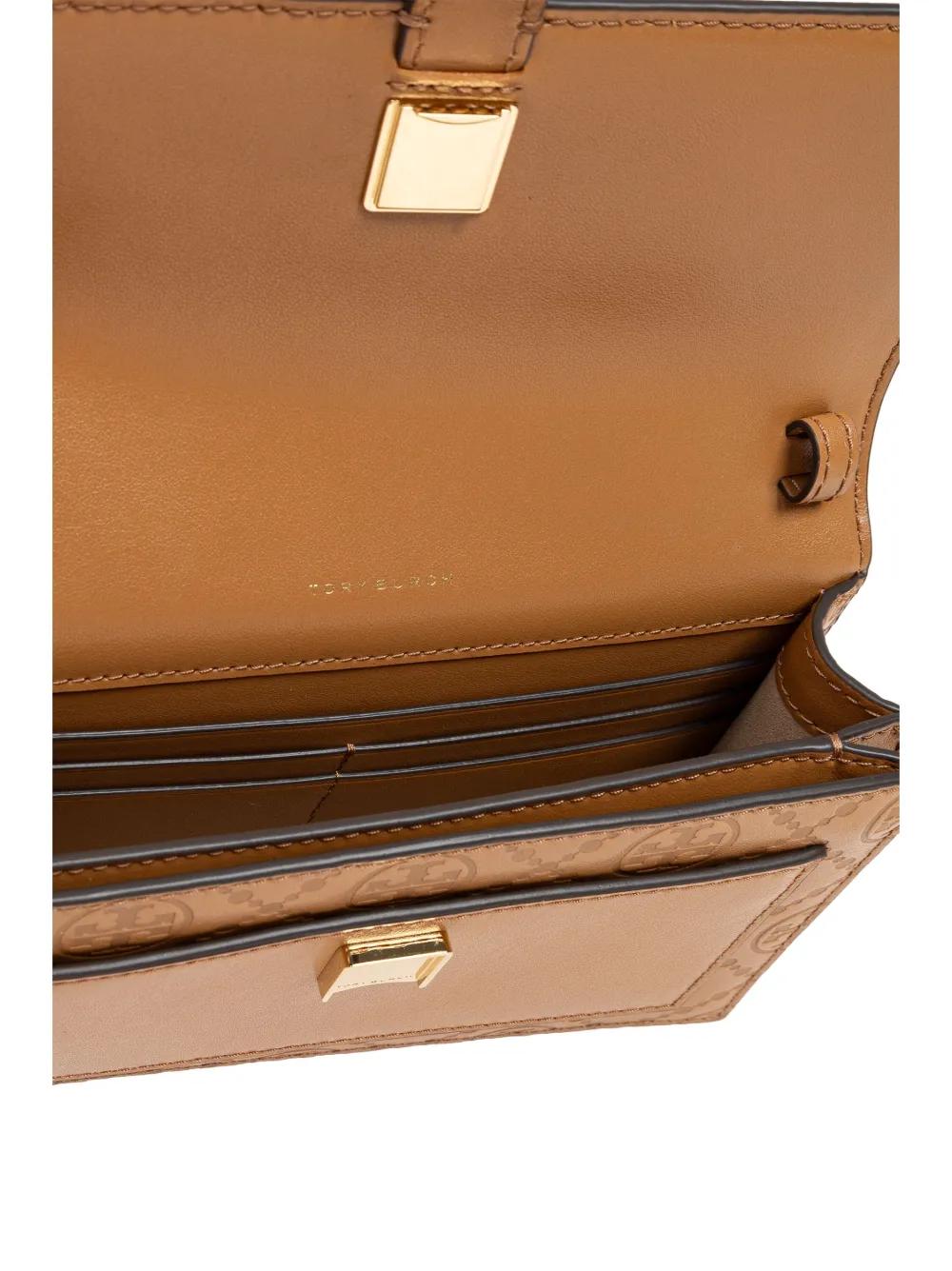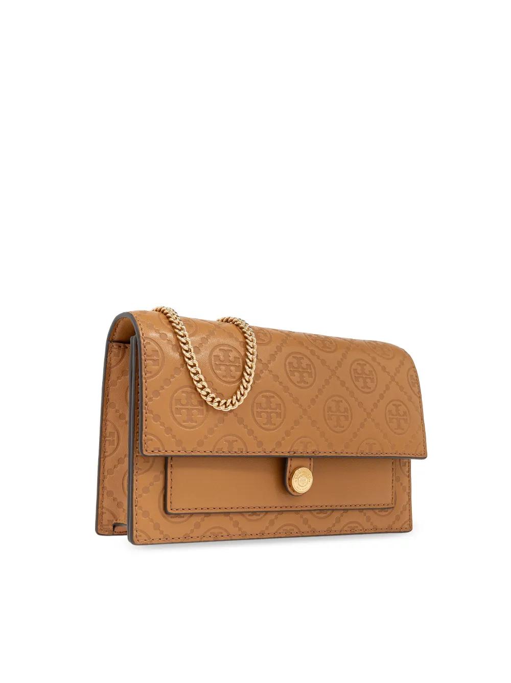 camel brown calf leather smooth grain debossed monogram pattern gold-tone hardware foldover top with press-stud fastening chain-link shoulder strap front patch pocket internal logo stamp partitioned compartment