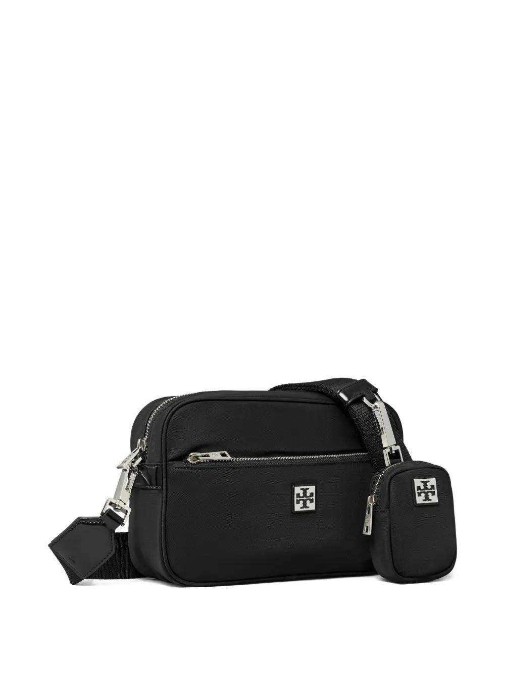 black adjustable shoulder strap detachable mini pouch front zip pocket silver-tone hardware