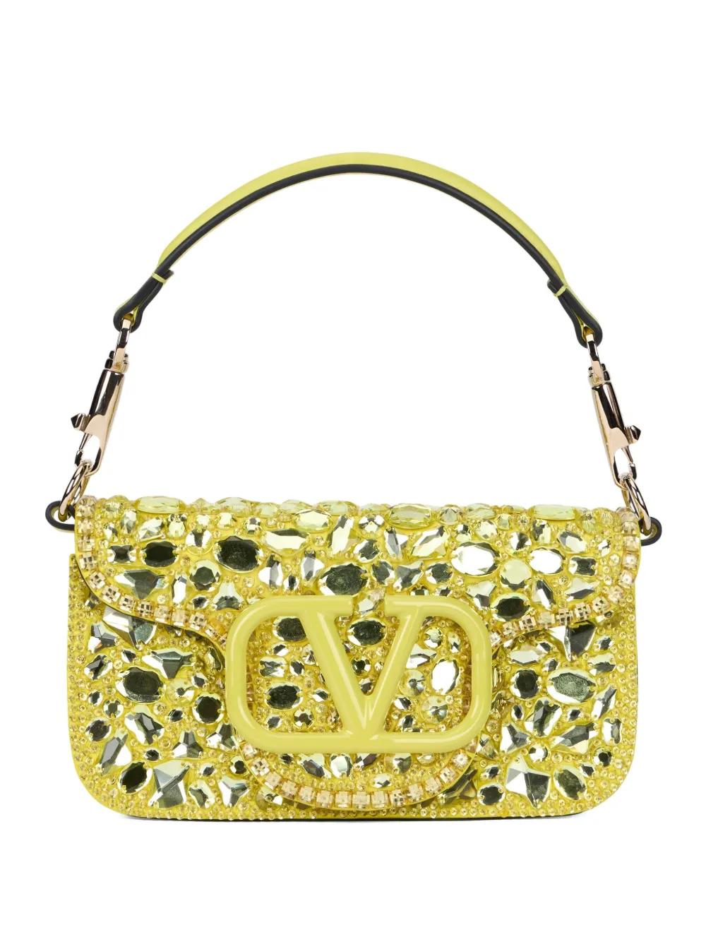 lime green lambskin crystal embellishment signature V logo plaque foldover top with magnetic fastening detachable leather and chain-link shoulder strap main compartment