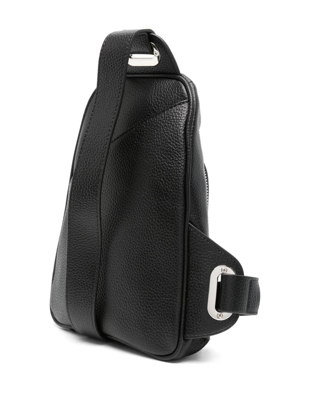 black calf leather grained texture front zip fastening adjustable shoulder strap signature Orb plaque detail rear patch pocket main compartment internal logo patch internal patch pocket full lining