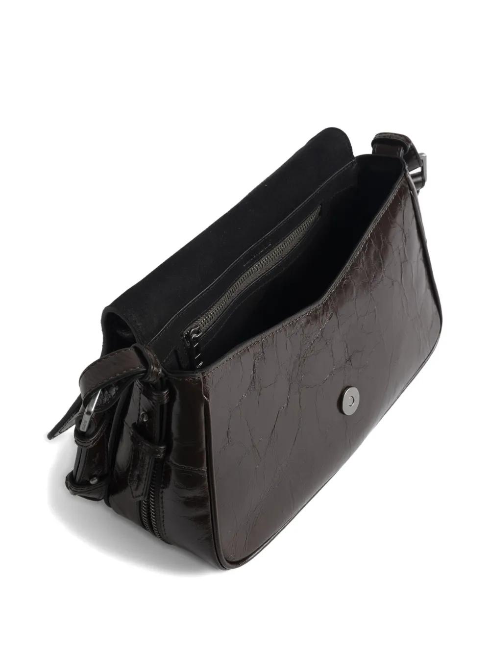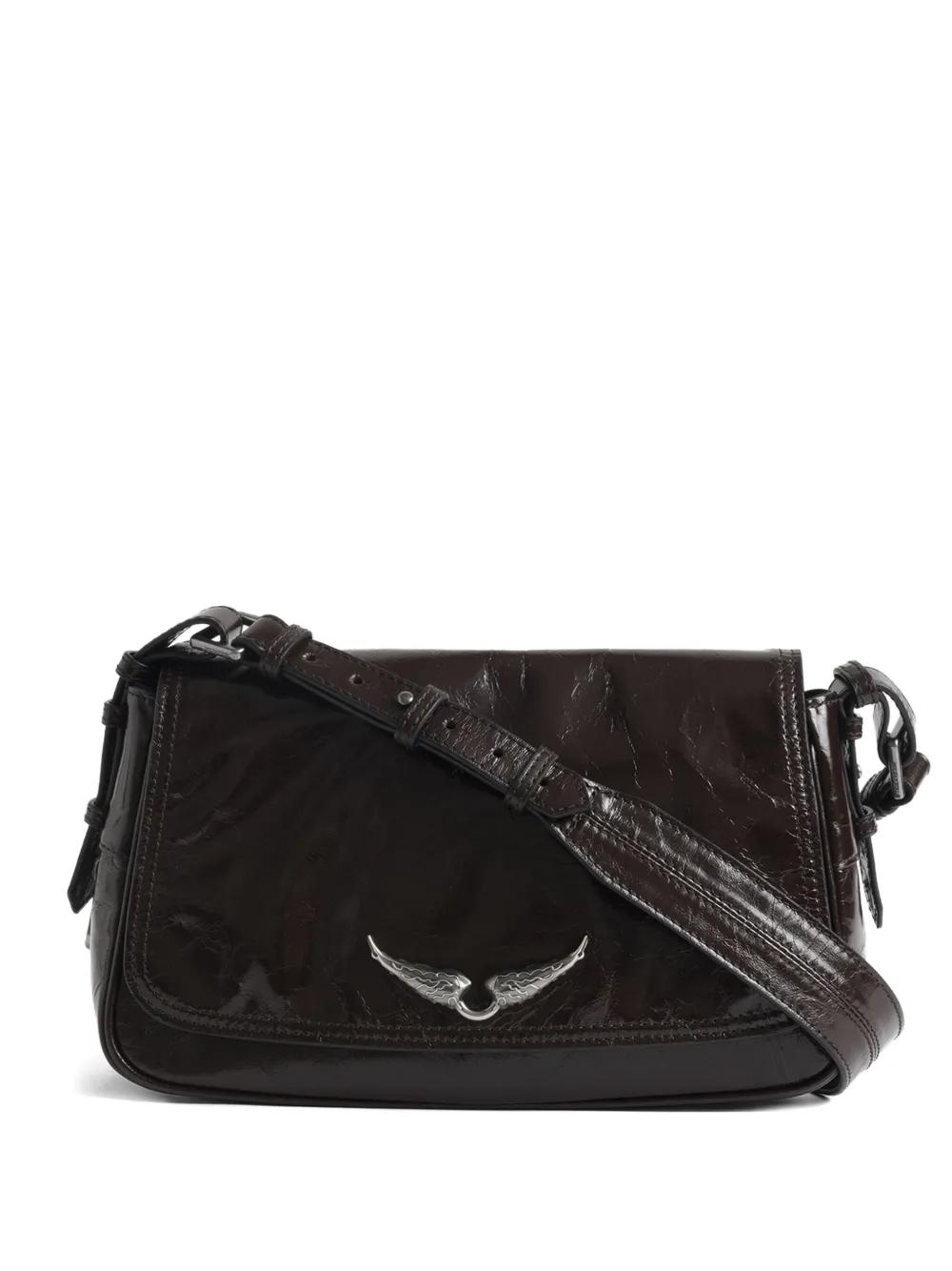 dark brown patent finish silver-tone hardware adjustable shoulder strap top zip fastening wings detail
