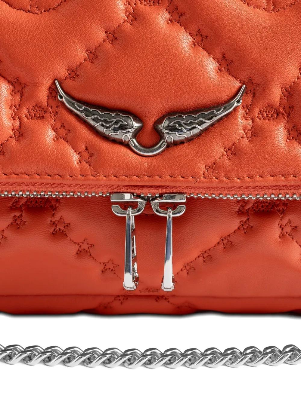 orange quilted leather embossed logo chain strap flap closure zip fastening