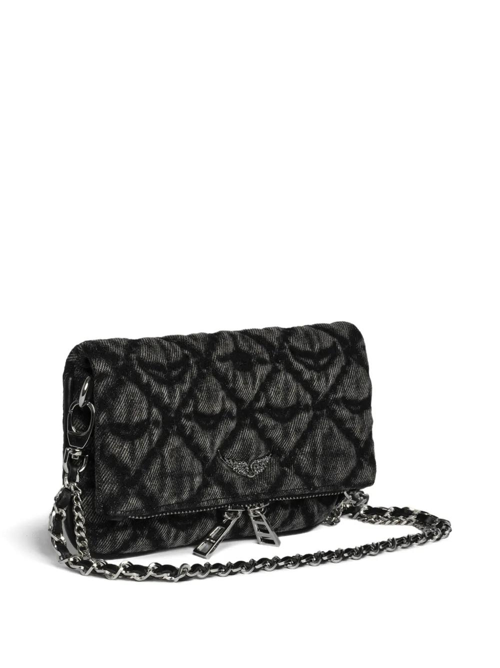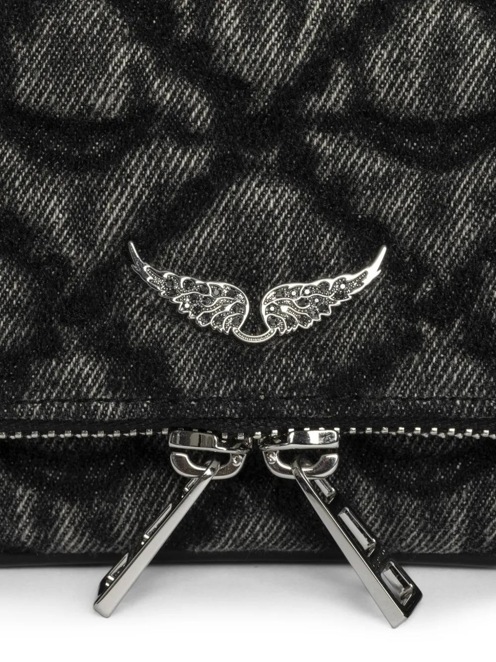black quilted denim effect wing embellishment zip fastening chain strap two-way zip closure