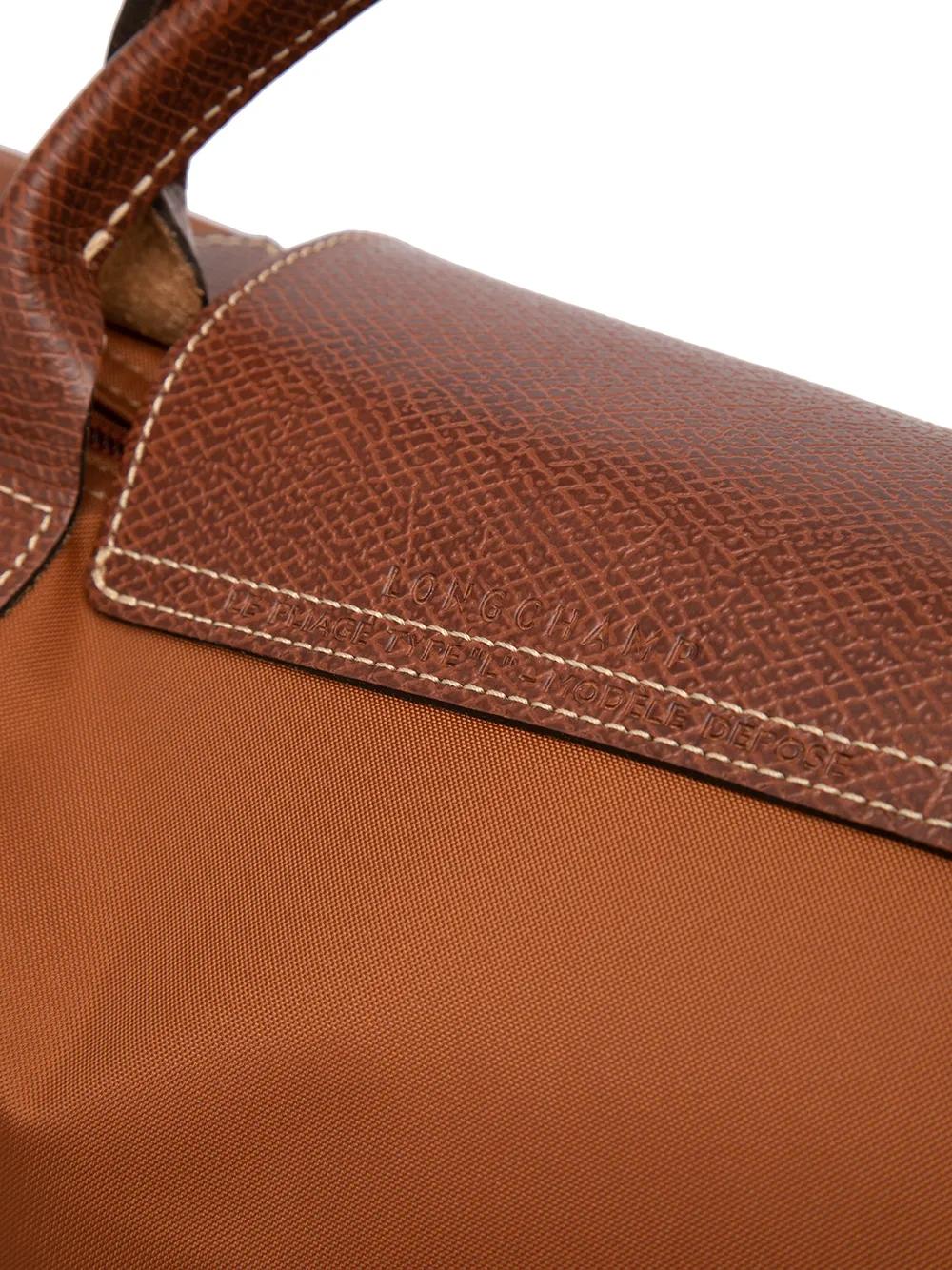 tobbaco-brown folding design embossed logo to the front contrast stitching main compartment top zip fastening foldover top with snap fastening two top handles