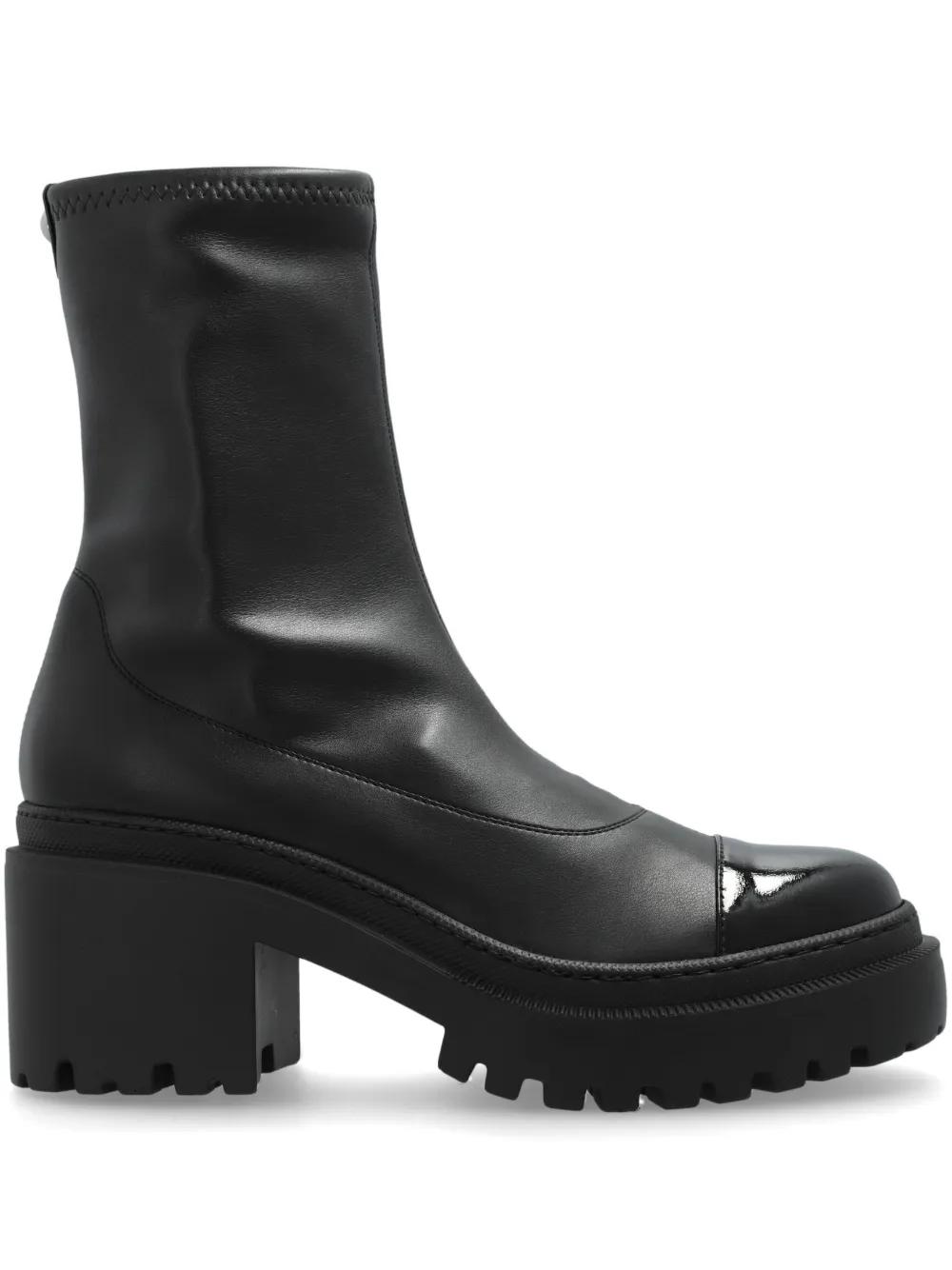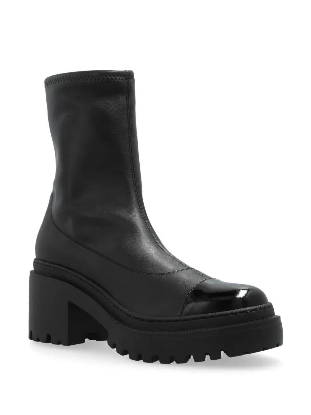 black calf leather smooth grain panelled design silver-tone stud detailing round toe ankle-length pull-on style pull-tab at the heel branded leather insole mid block heel chunky rubber sole