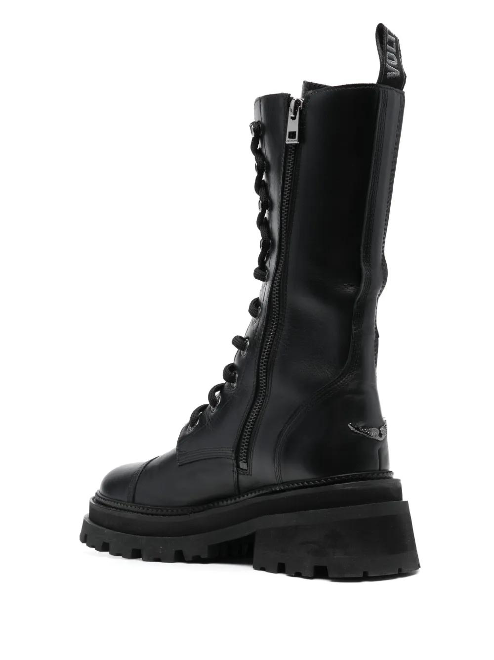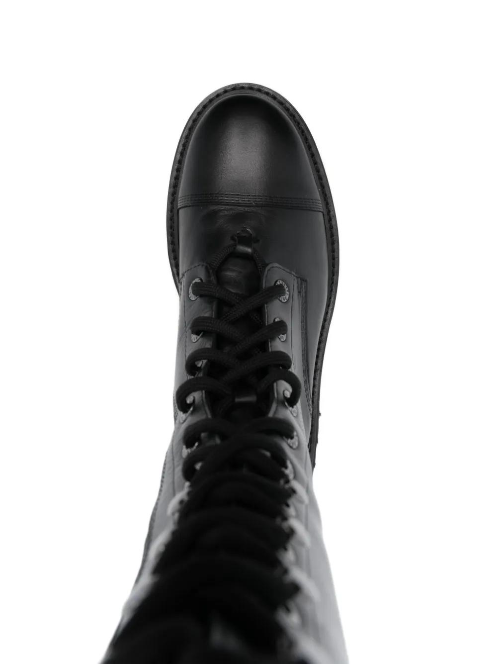 black calf leather smoothing finish round toe front lace-up fastening side zip fastening pull-tab at the heel knee-length mid block heel ridged rubber sole