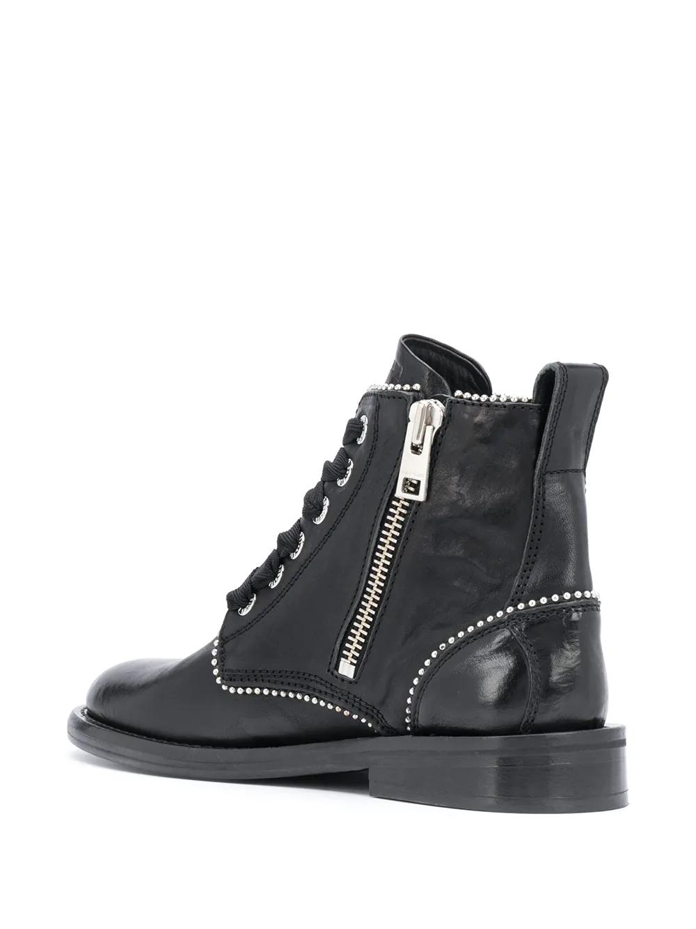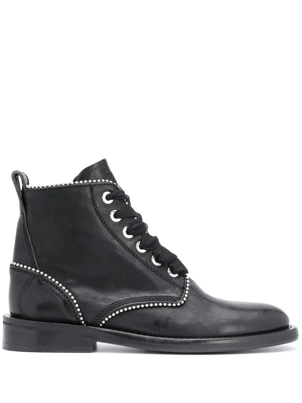black leather silver-tone stud detailing almond toe logo-embossed tongue flat leather sole