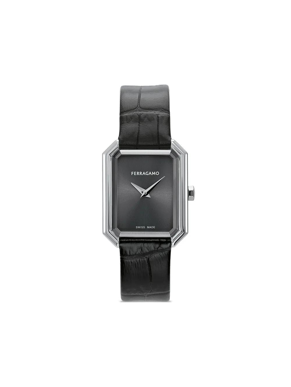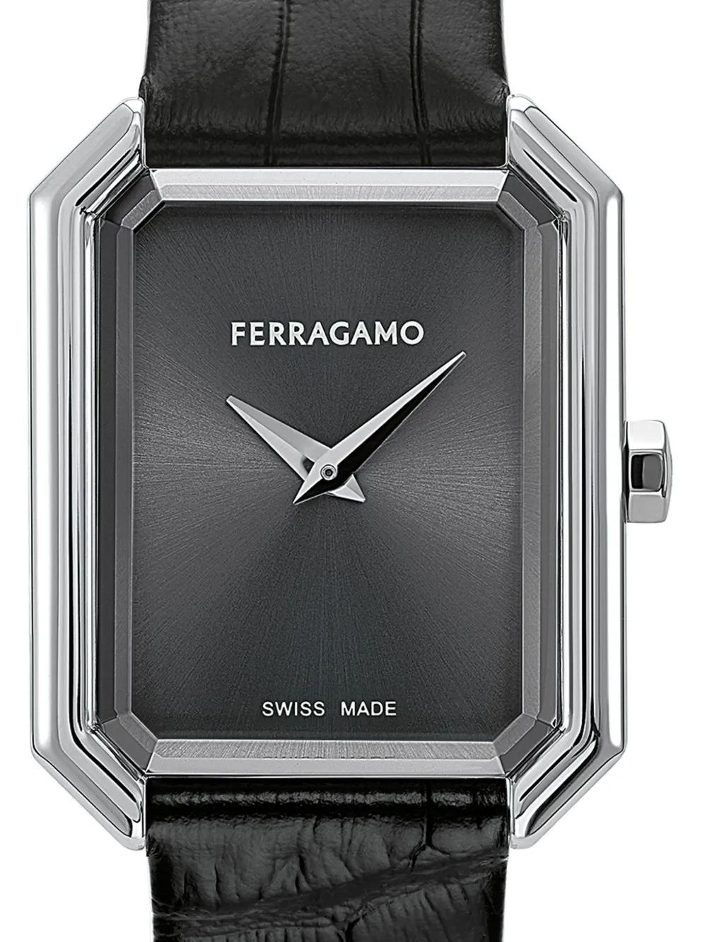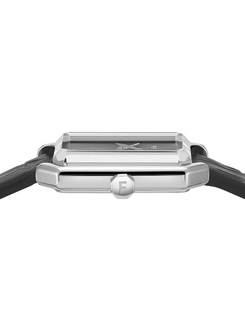 26.5mm x 33.5mm stainless steel case quartz movement black arrow hands screw-down crown leather strap pin-buckle fastening This item comes with a standard two-year warranty from the brand.