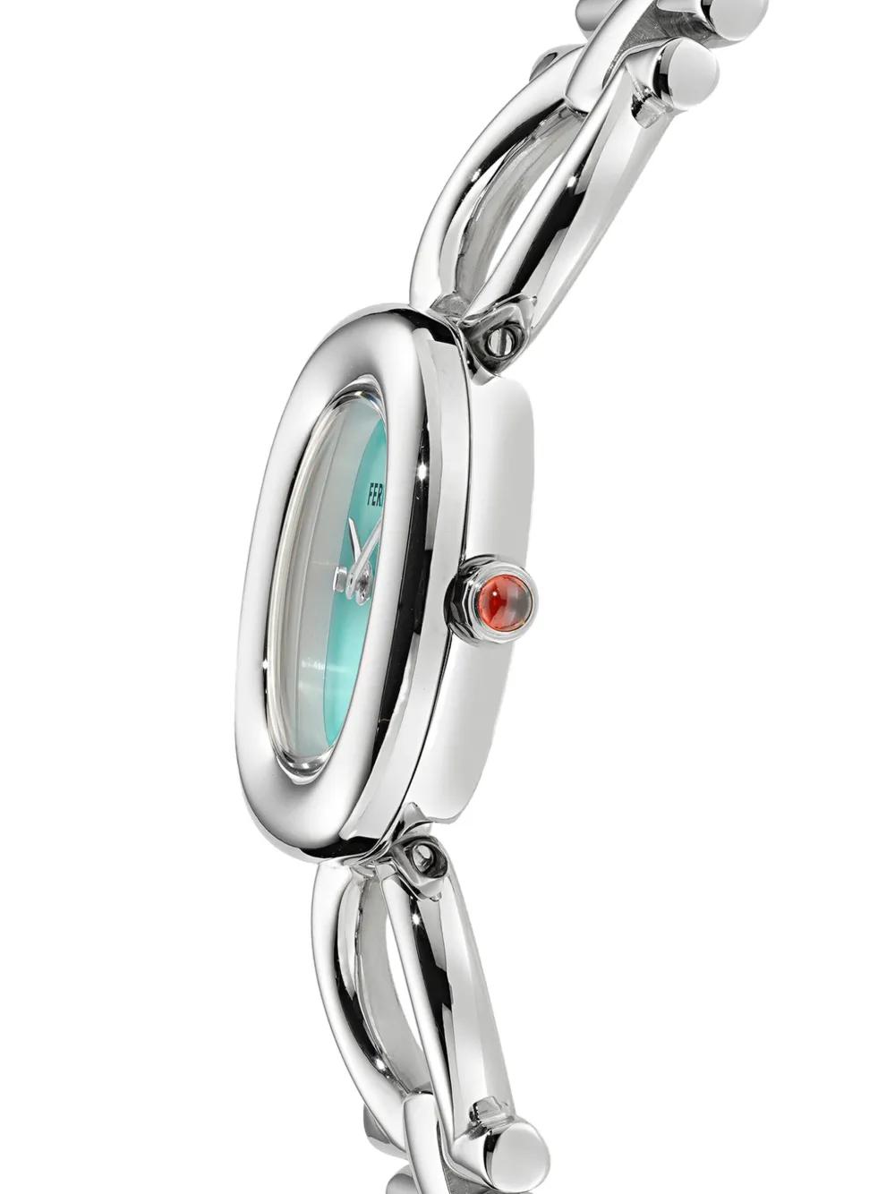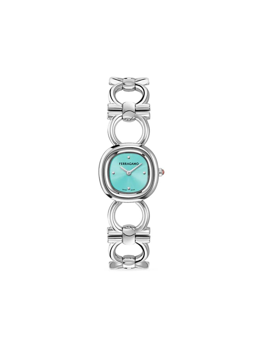 25mm stainless steel quartz movement round face light blue sunray-patterned dial sapphire-crystal glass screw-down crown double Gancini bracelet buckle fastening water resistance up to 50m/5 ATM This item comes with a standard two-year warranty from the brand.
