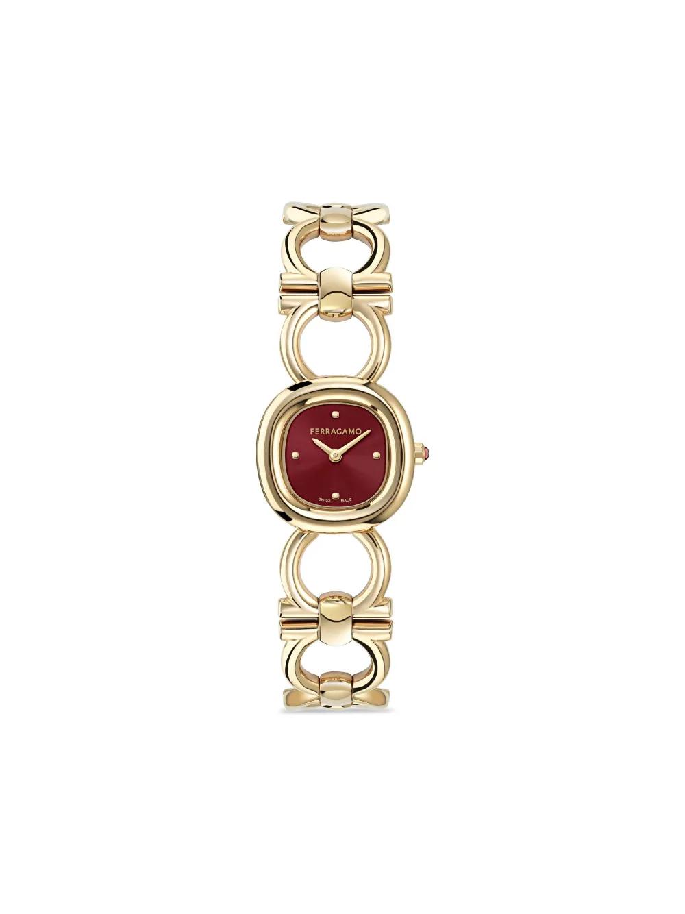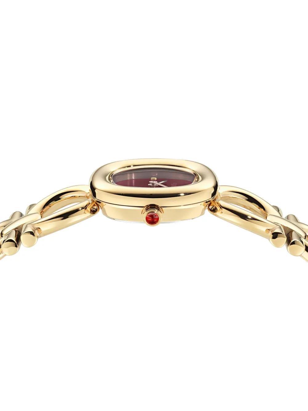 25mm yellow gold/stainless steel quartz movement round face burgundy sunray-patterned dial sapphire-crystal glass screw-down crown double Gancini bracelet buckle fastening water resistance up to 50m/5 ATM This item comes with a standard two-year warranty from the brand.