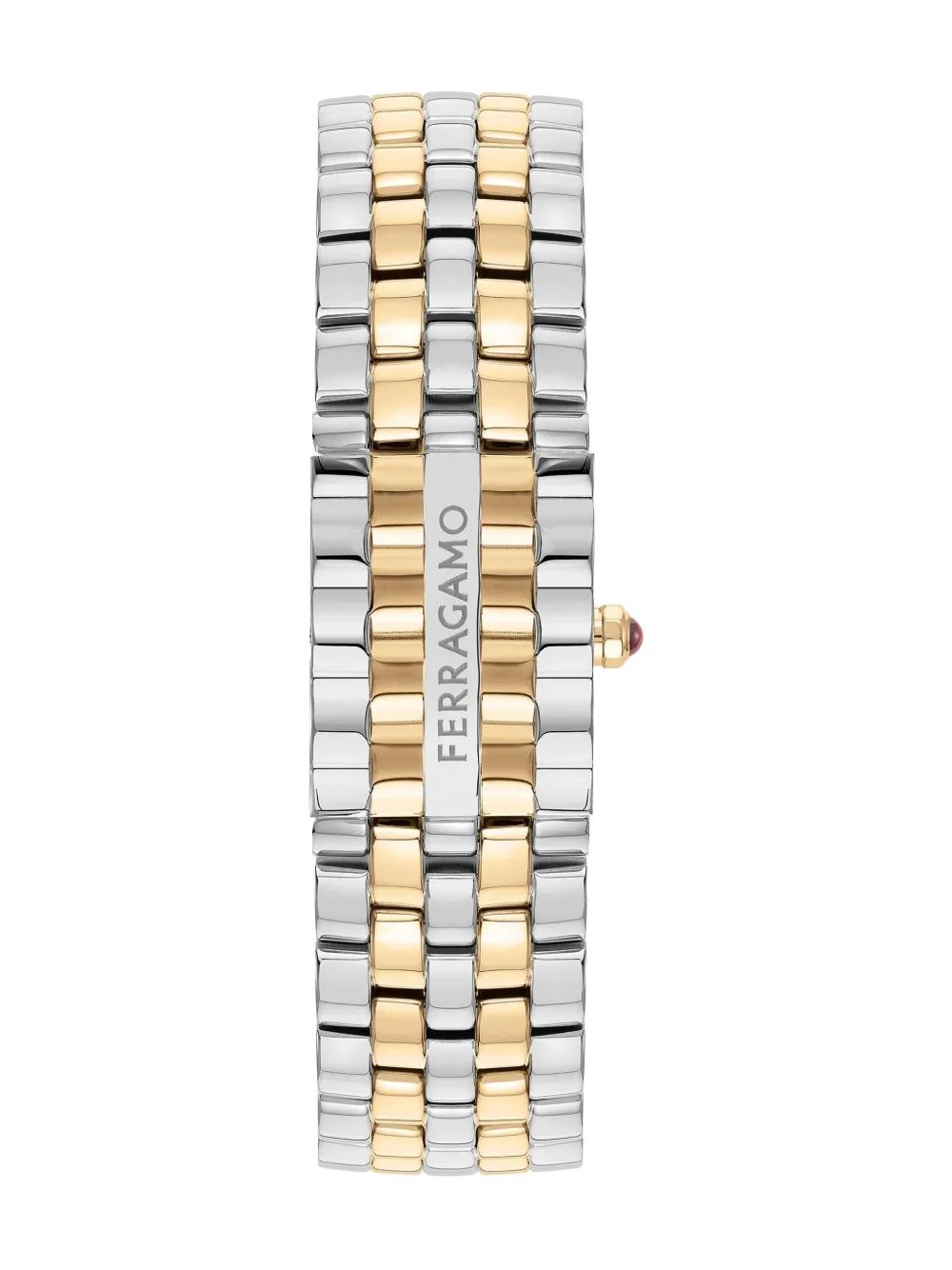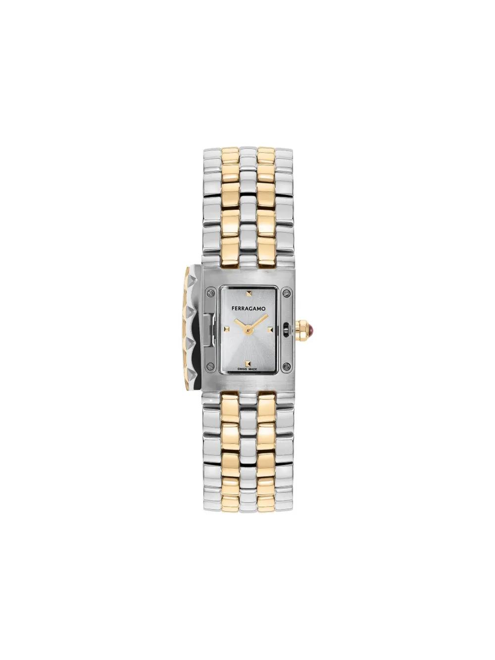 30mm x 18.5mm yellow gold quartz movement rectangular face sunray-patterned dial baton hands cabochon crown sapphire-crystal glass anti-reflective coating scratch-resistant glass stainless steel and gold link bracelet butterfly clasp fastening water resistance up to 30m/3 ATM This item comes with a standard two-year warranty from the brand. Your purchase will arrive with a gift box.
