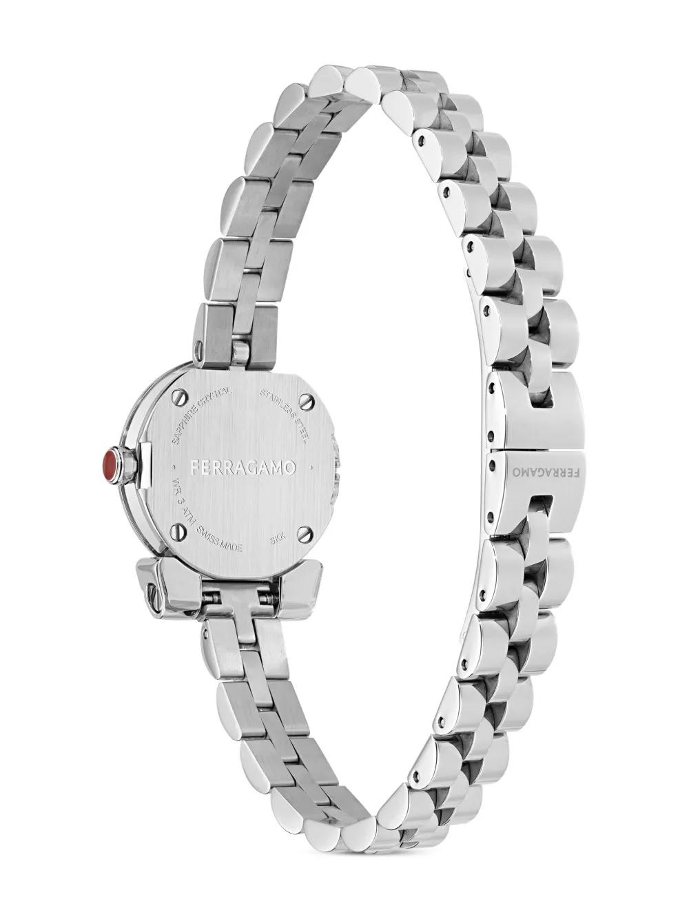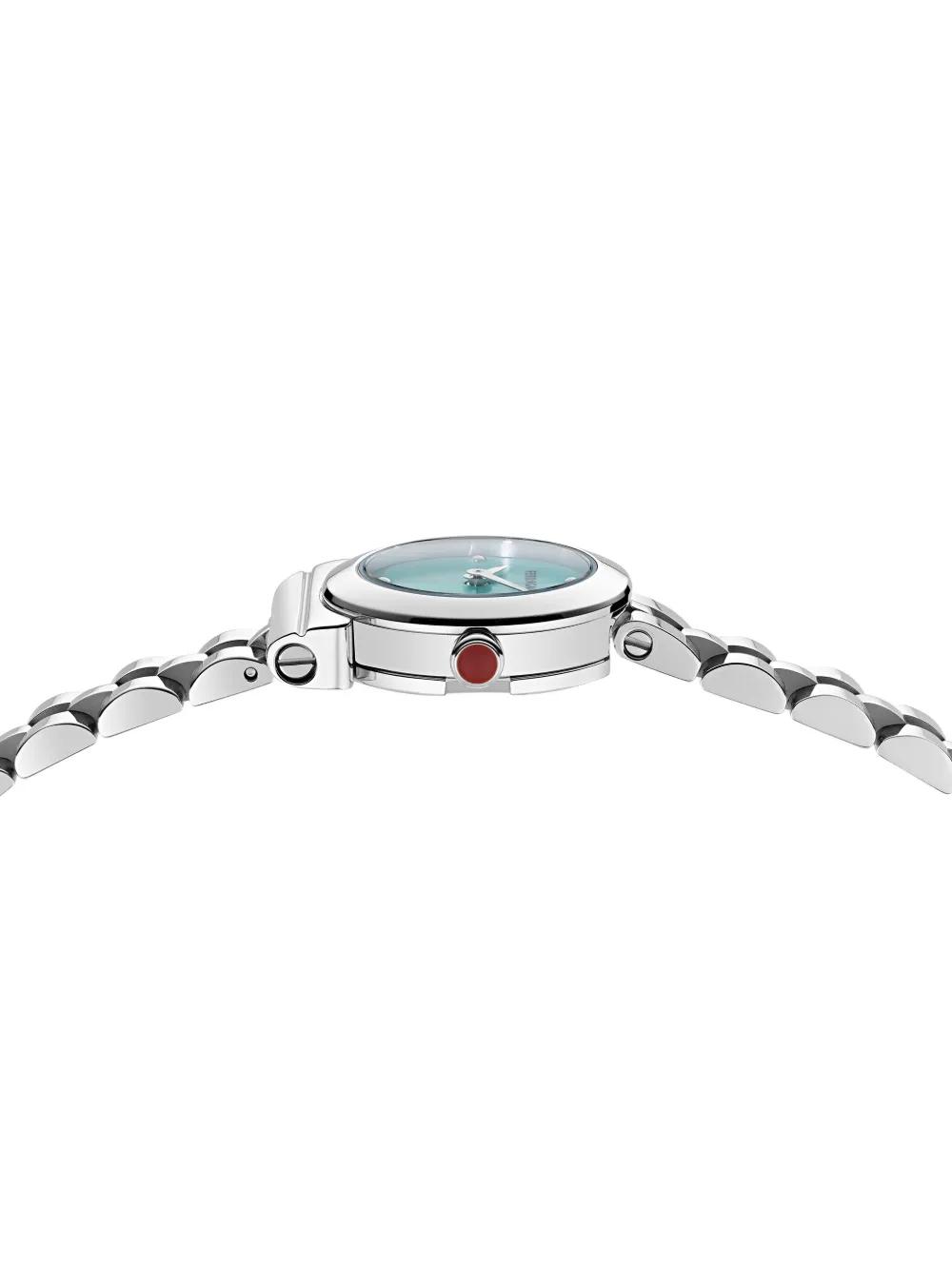 silver-tone stainless steel case quartz movement light blue geometric dial arrow hands round face screw-down crown stainless steel link bracelet folding clasp interchangeable strap water resistance up to 30m/3 ATM This item comes with a standard two-year warranty from the brand.