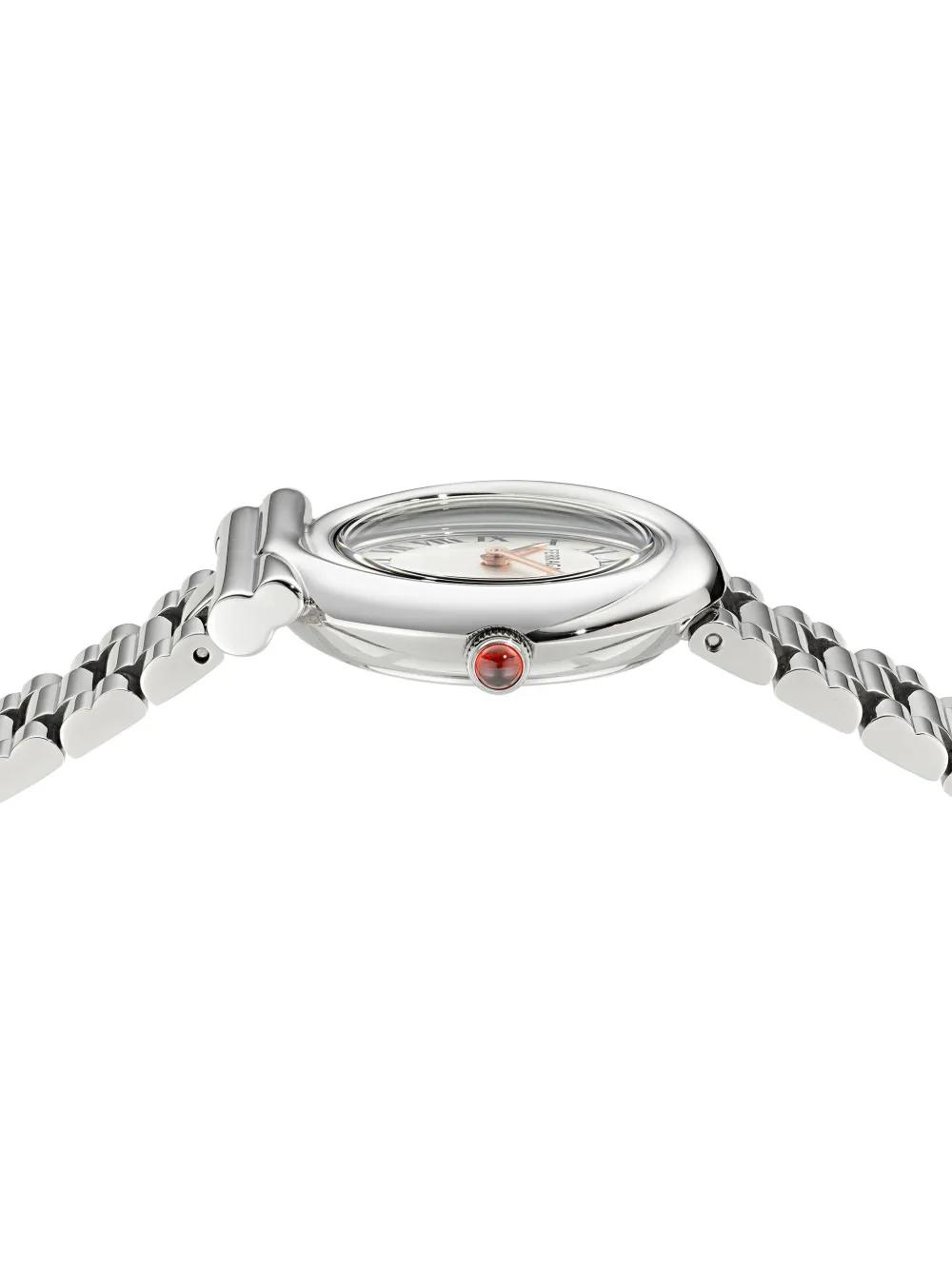 28mm silver-tone Roman numeral dial stainless steel folding clasp water resistance up to 50m/5 ATM quartz movement baton hands cabochon crown This item comes with a standard two-year warranty from the brand.