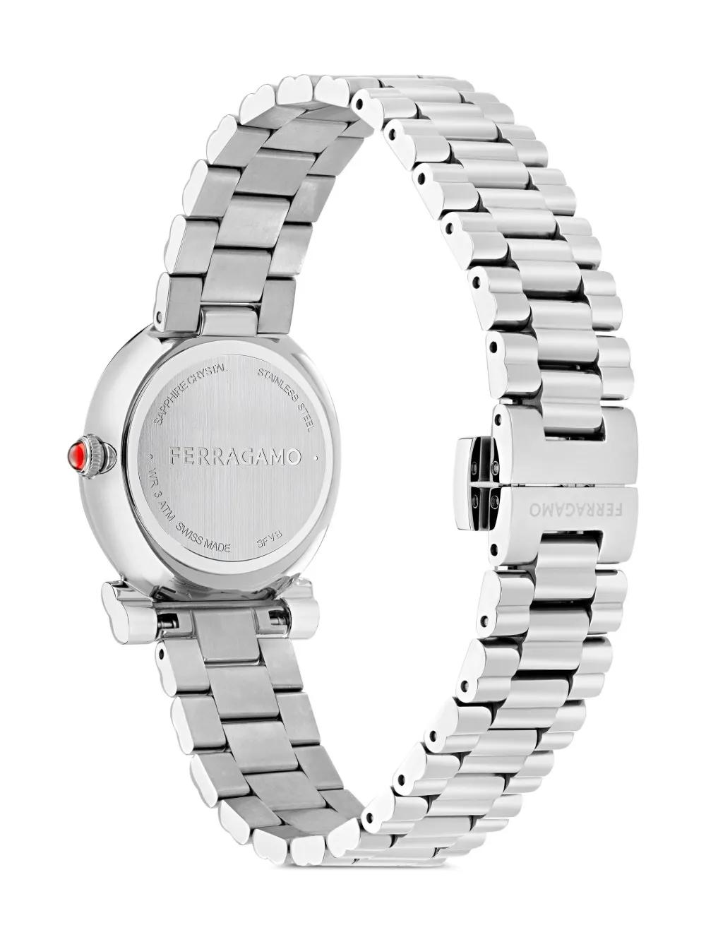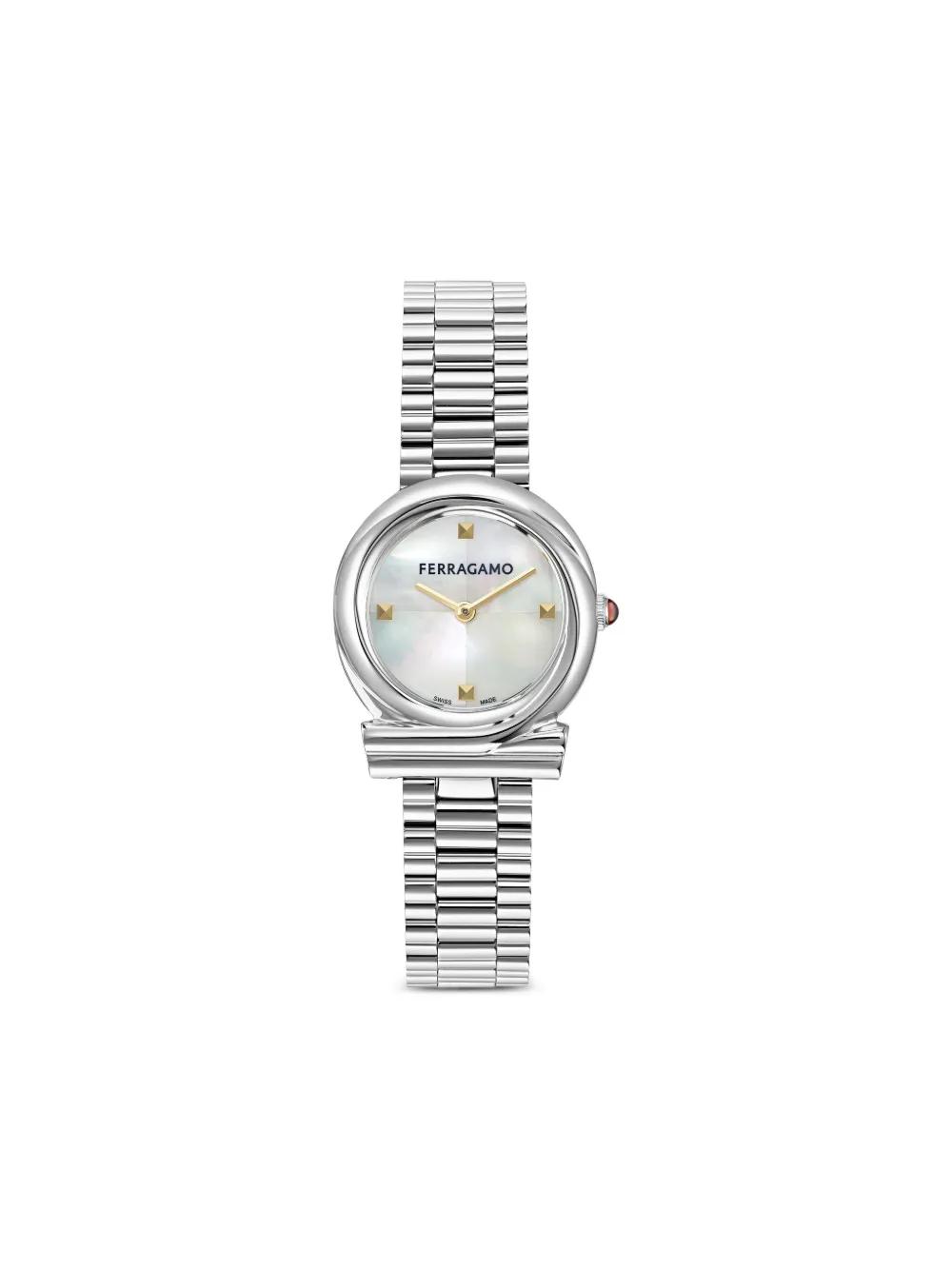 28mm stainless steel case quartz movement white dial index dial baton hands sapphire-crystal glass Gancini shaped bezel stainless steel link bracelet push-button folding clasp screw-down crown water resistance up to 30m/3 ATM This item comes with a standard one-year warranty from the boutique.