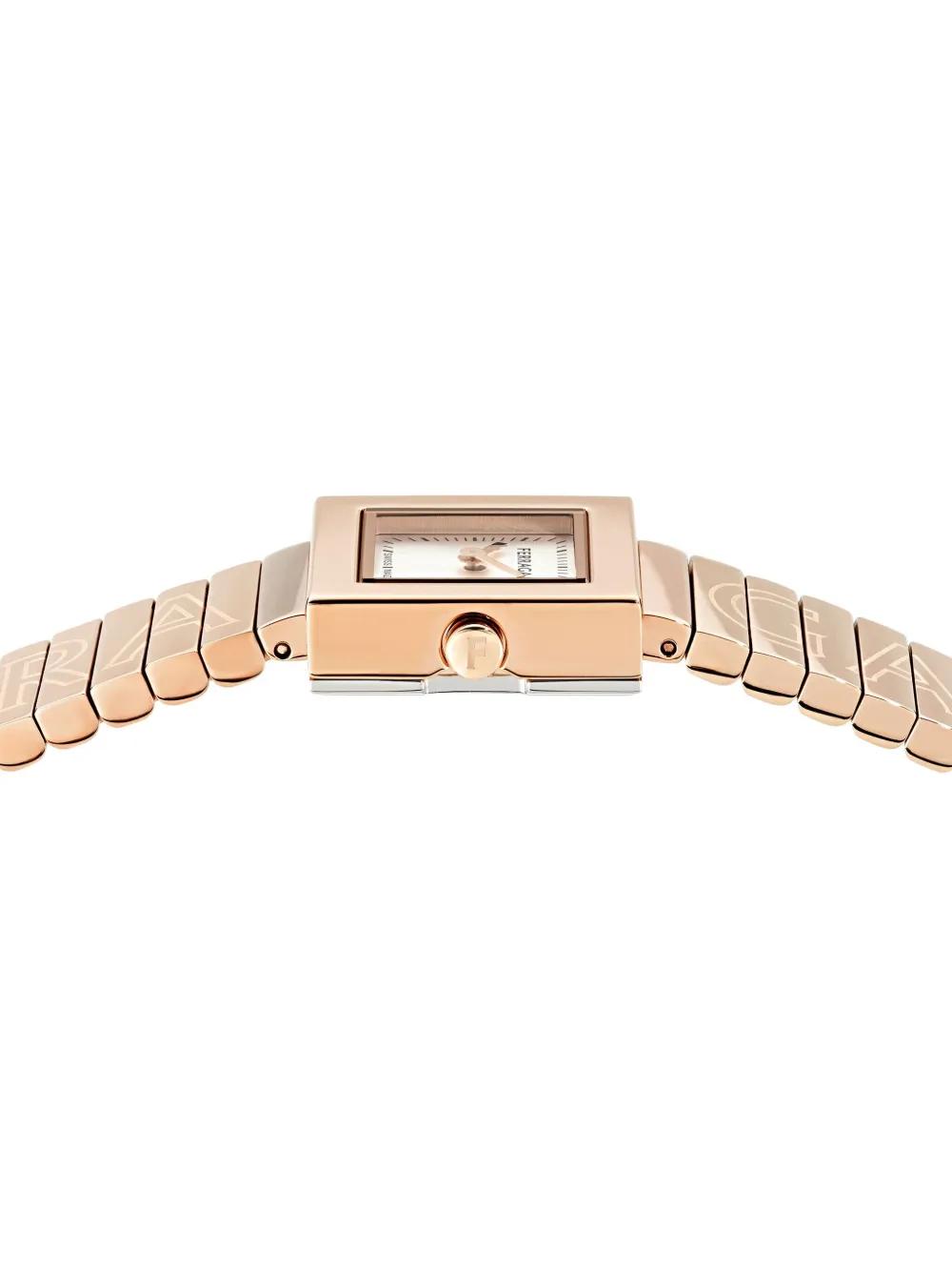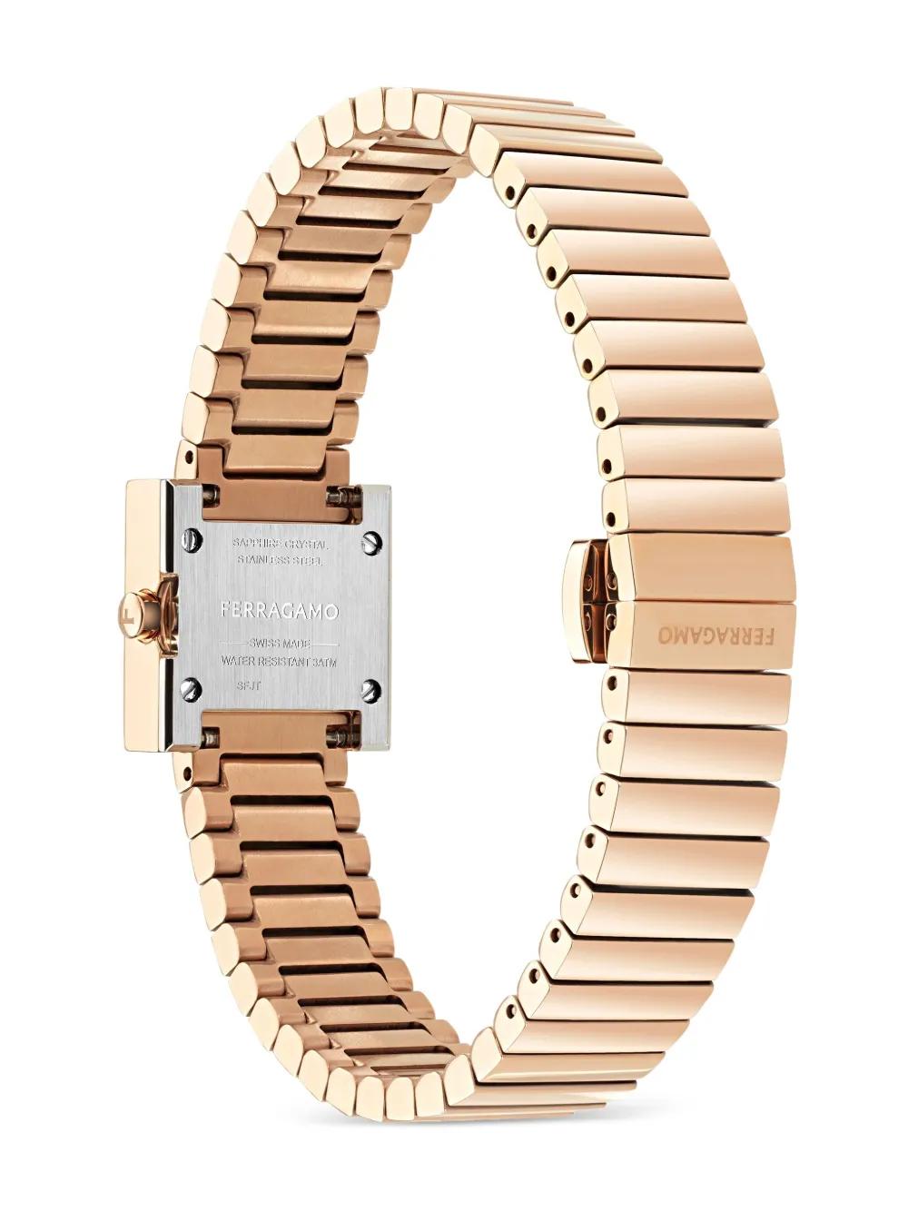 20mm x 20mm rose gold/stainless steel quartz movement square face silver baton hands screw-down crown adjustable link bracelet push-button folding clasp This item comes with a standard two-year warranty from the brand.