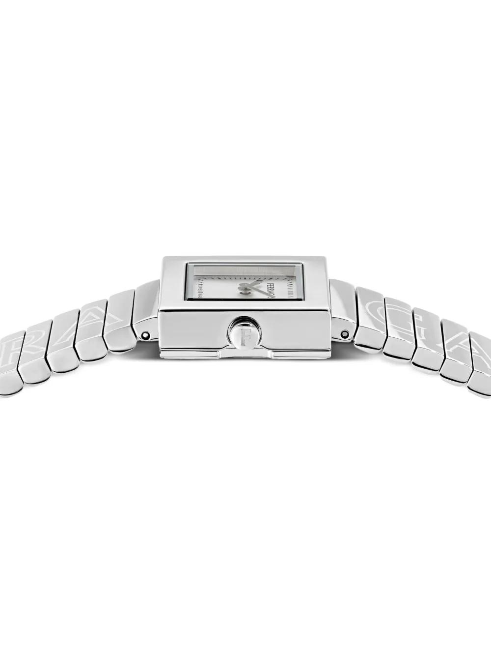 20mm x 20mm stainless steel quartz movement square face silver baton hands screw-down crown adjustable link bracelet push-button folding clasp This item comes with a standard two-year warranty from the brand.