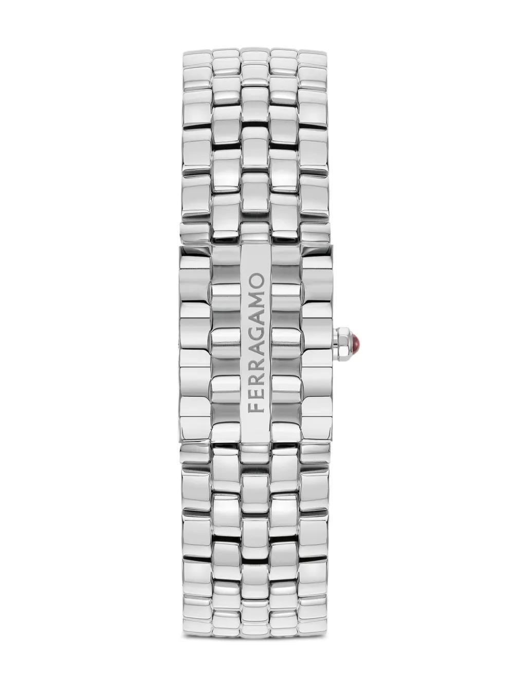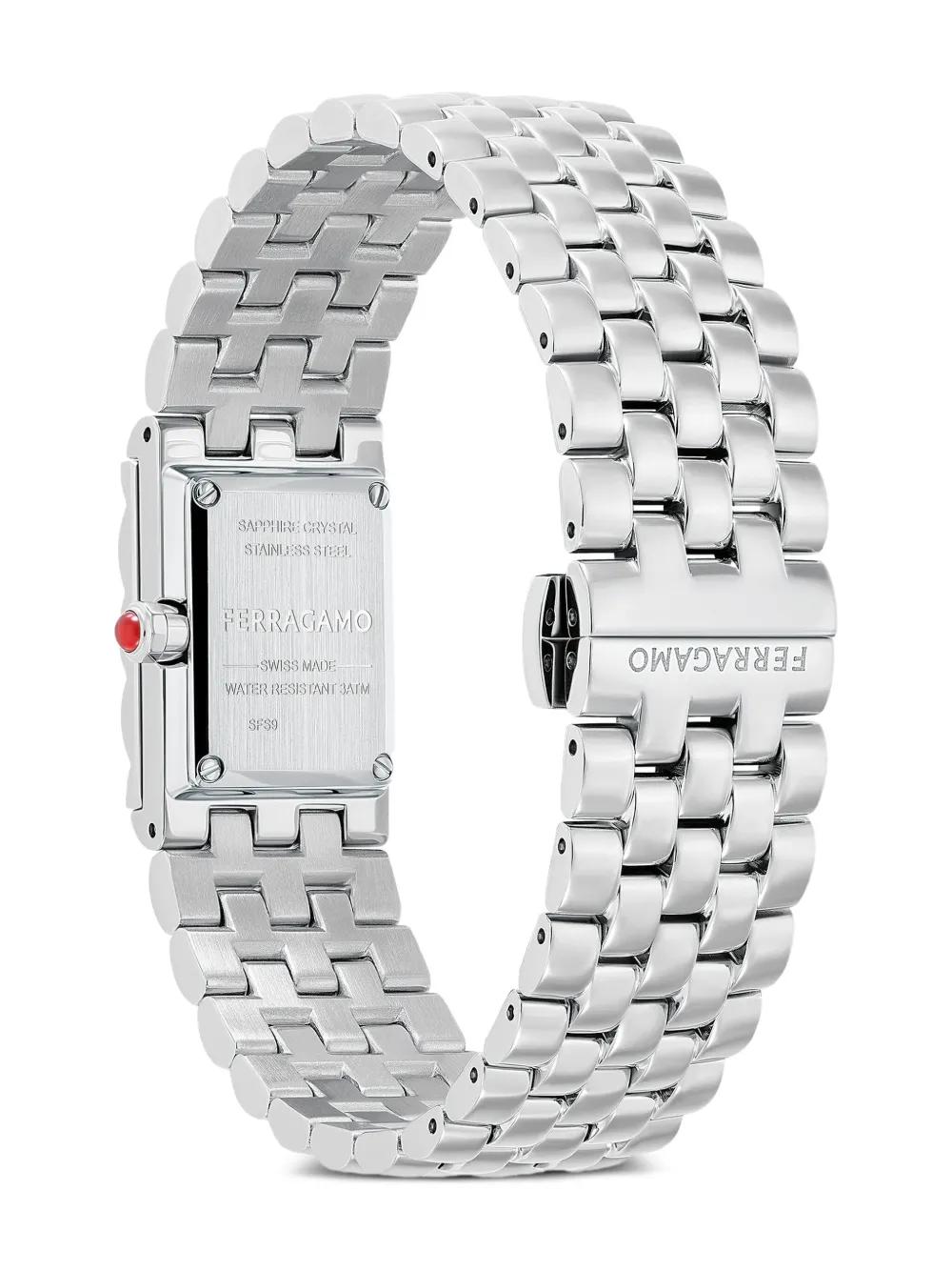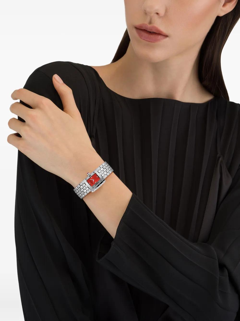 red dial 18.5 x 30mm rectangle face quartz movement textured bezel steel bracelet water resistance up to 30m/3 ATM This item comes with a standard two-year warranty from the brand.
