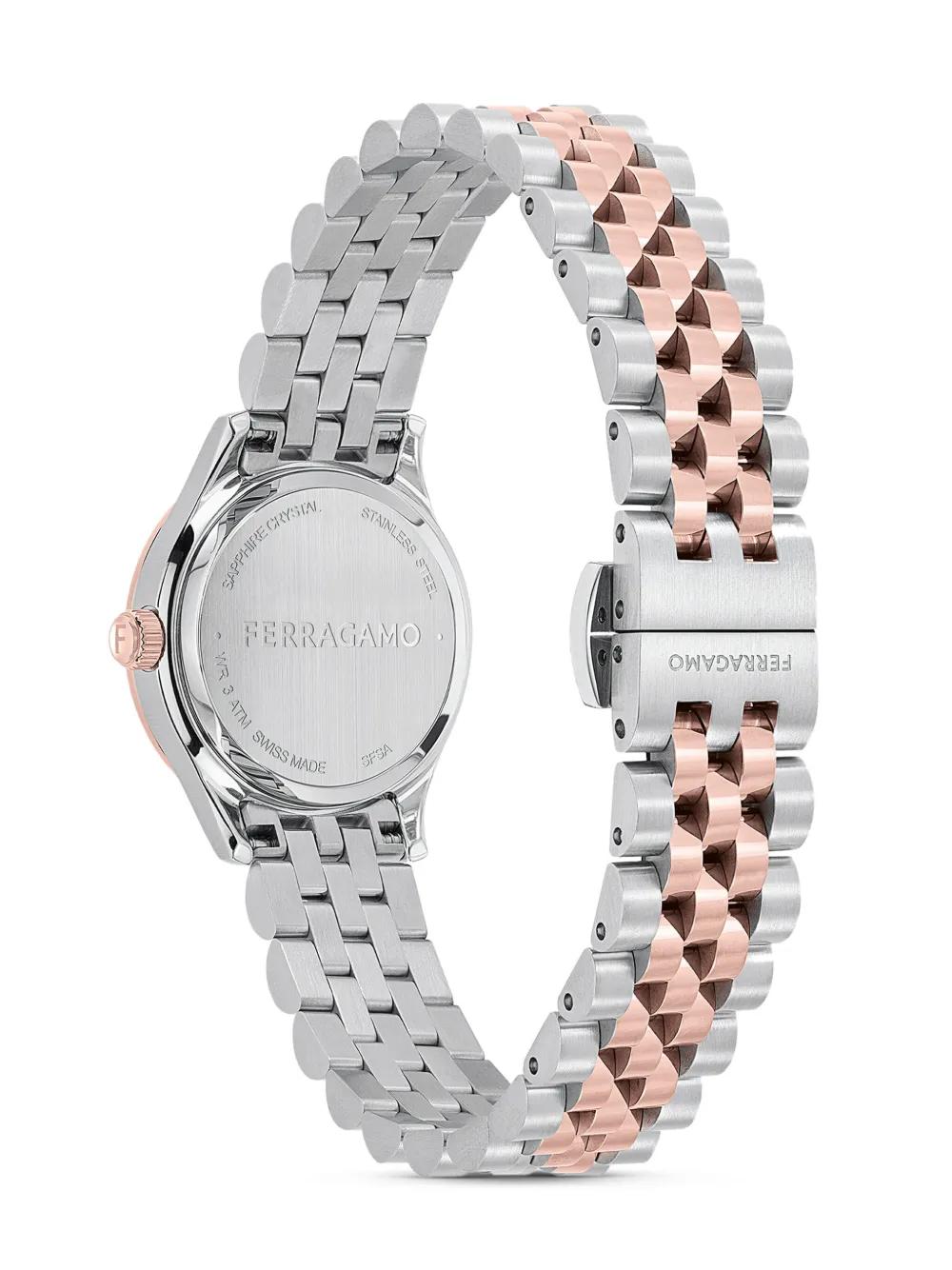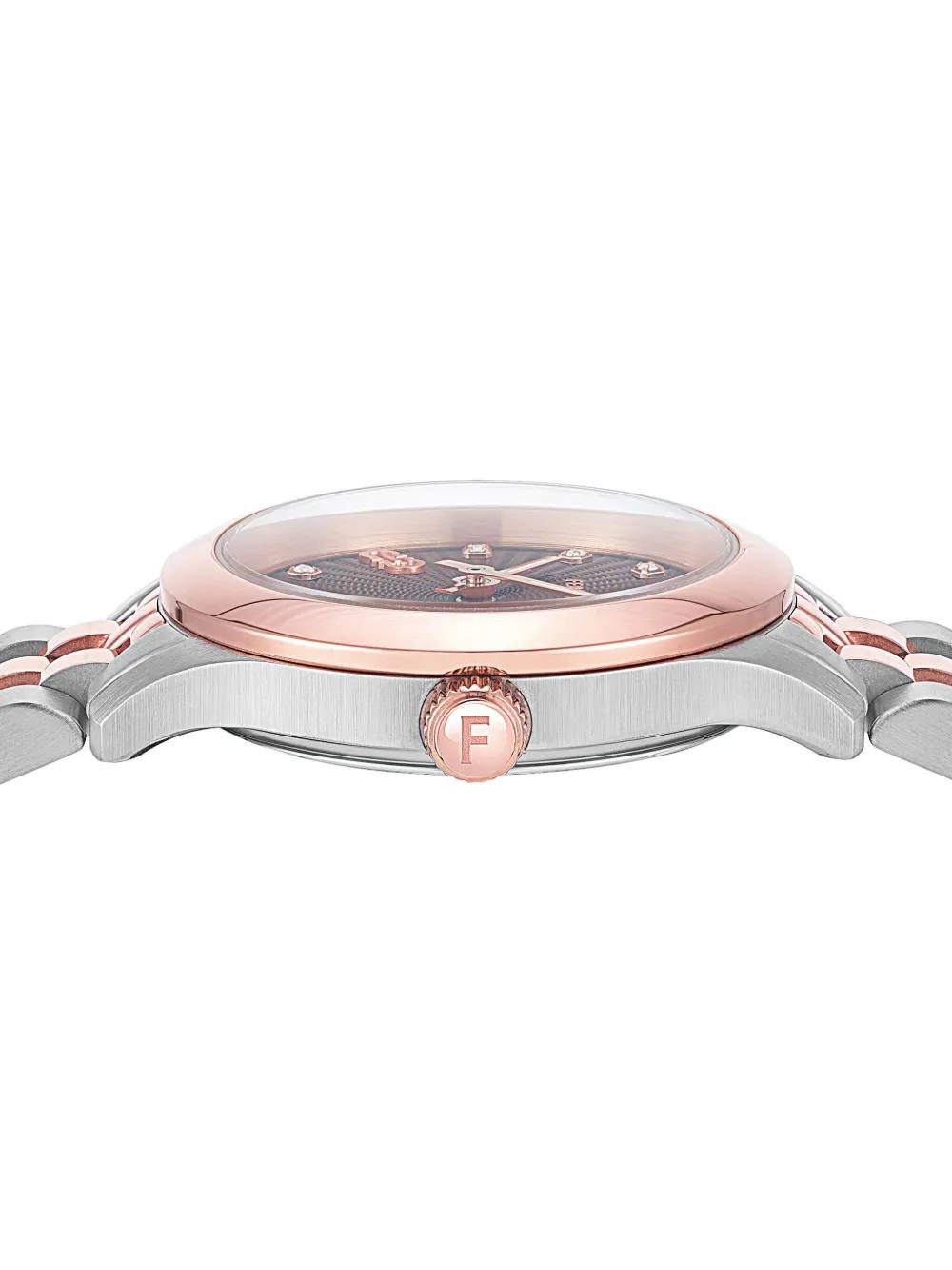 25mm rose gold plated stainless steel case quartz movement black diamond dial baton hands screw-down crown stainless steel link bracelet butterfly clasp fastening water resistance up to 50m/5 ATM This item comes with a standard two-year warranty from the brand.