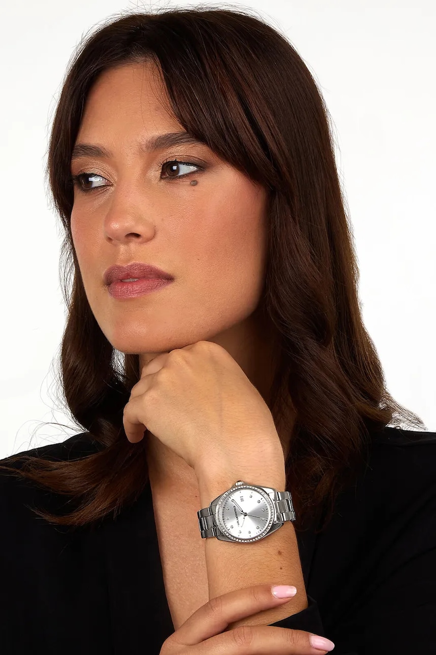 - Materiał koperty i bransolety: stal nierdzewna. - Kształt koperty: okrągły. - Segmentowa bransoleta. - Wodoszczelność: WR. 50M (5ATM) - odporny na zachlapania, pływanie powierzchniowe. - Szkło: mineralne (utwardzane, bardzo odporne na stłuczenia, ciężko je zarysować). - Mechanizm: kwarcowy, zasilany baterią. - Posiada datownik. - Model ozdobiony kryształkami. - Grubość koperty: 9,3 mm. - Szerokość koperty: 35 mm.