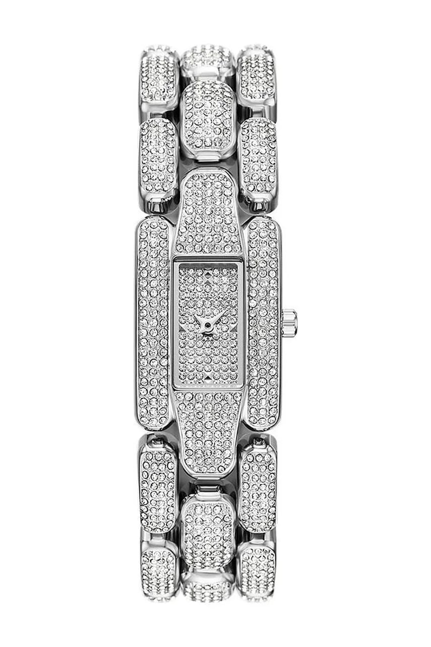 - Wodoszczelność: WR. 50M (5ATM) - odporny na zachlapania, pływanie powierzchniowe. - Szkło: mineralne (utwardzane, bardzo odporne na stłuczenia, ciężko je zarysować). - Mechanizm: kwarcowy, zasilany baterią. - Model ozdobiony kryształkami. - Szerokość paska: 20 mm. - Grubość koperty: 10 mm. - Szerokość koperty: 21 mm.