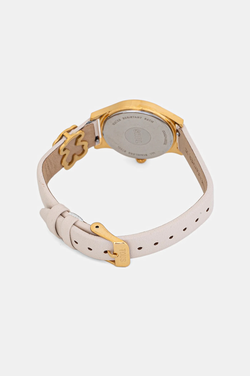 - Materiał paska: skóra naturalna. - Regulowany obwód zapewnia indywidualne dopasowanie. - Kształt koperty: okrągły. - Materiał koperty: stal. - Szkło: mineralne (utwardzane, bardzo odporne na stłuczenia, ciężko je zarysować). - Wodoszczelność: WR. 50M (5ATM) - odporny na zachlapania, pływanie powierzchniowe. - Mechanizm: kwarcowy, zasilany baterią. - Tarcza z masy perłowej. - Model zapakowany w pudełko firmowe. - Średnica koperty: 30 mm. - Grubość koperty: 5 mm. - Szerokość paska: 14 mm.