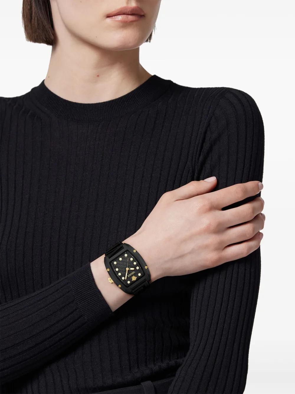 44mm black ceramic tonneau face geometric dial stick hands signature Greca-pattern print Medusa Head motif quartz movement screw-down crown rubber strap pin-buckle fastening This item comes with a standard one-year warranty from the boutique.