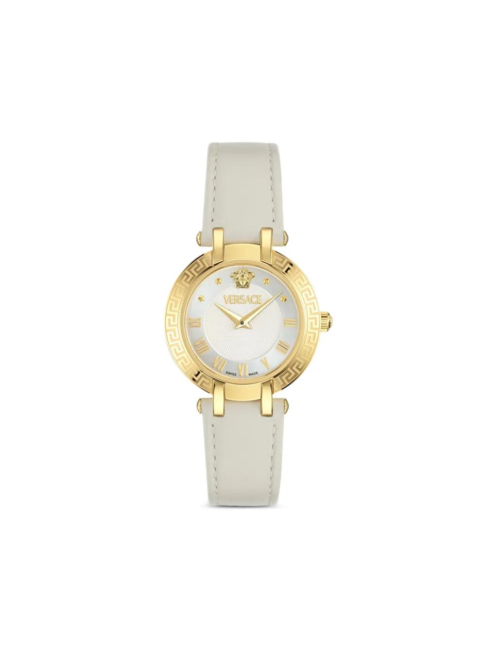 white dial round case shape 34mm case size roman numerals dial Greca engraved bezel quartz movement water resistance up to 30m/3 ATM This item comes with a standard one-year warranty from the boutique.