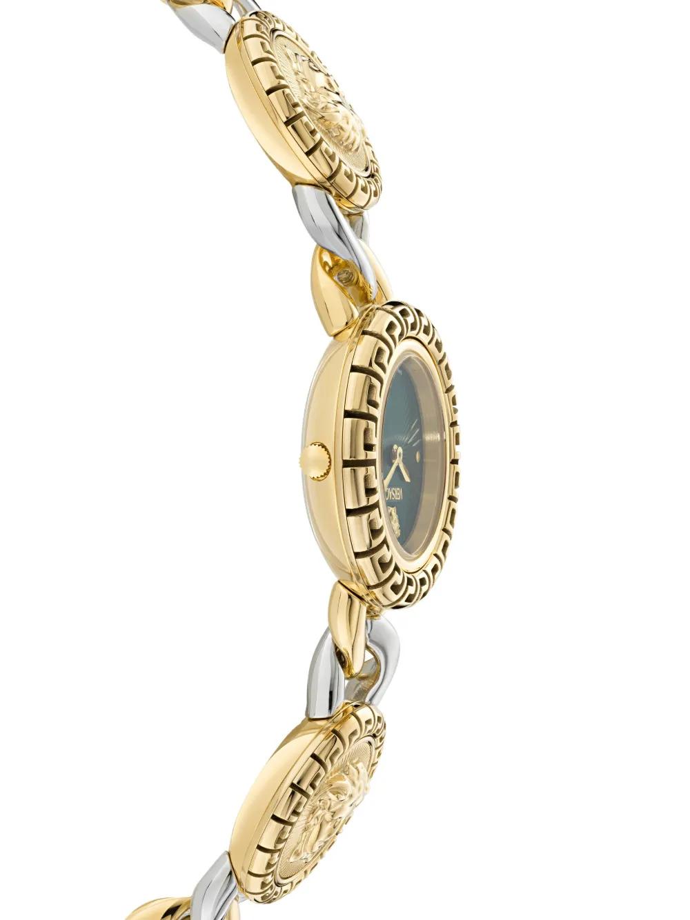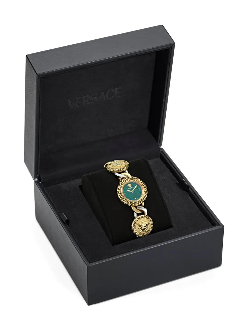 green dial round case shape quartz movement 28mm case size Greca bezel Medusa head embellishments water resistance up to 30m/3 ATM This item comes with a standard one-year warranty from the boutique.