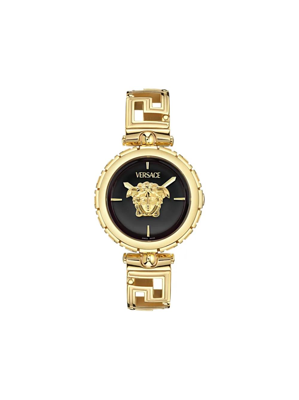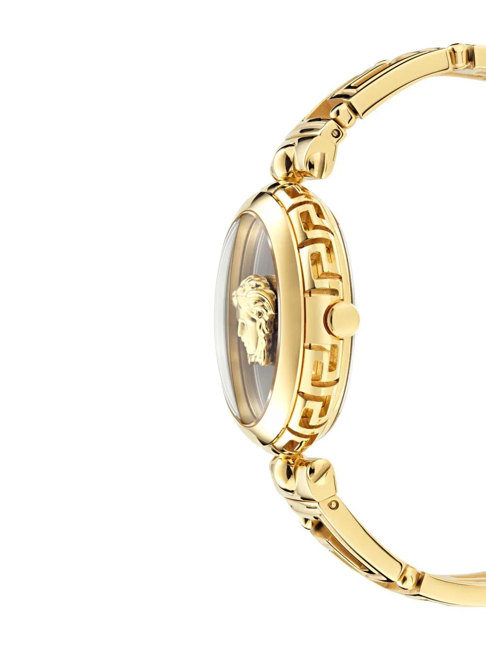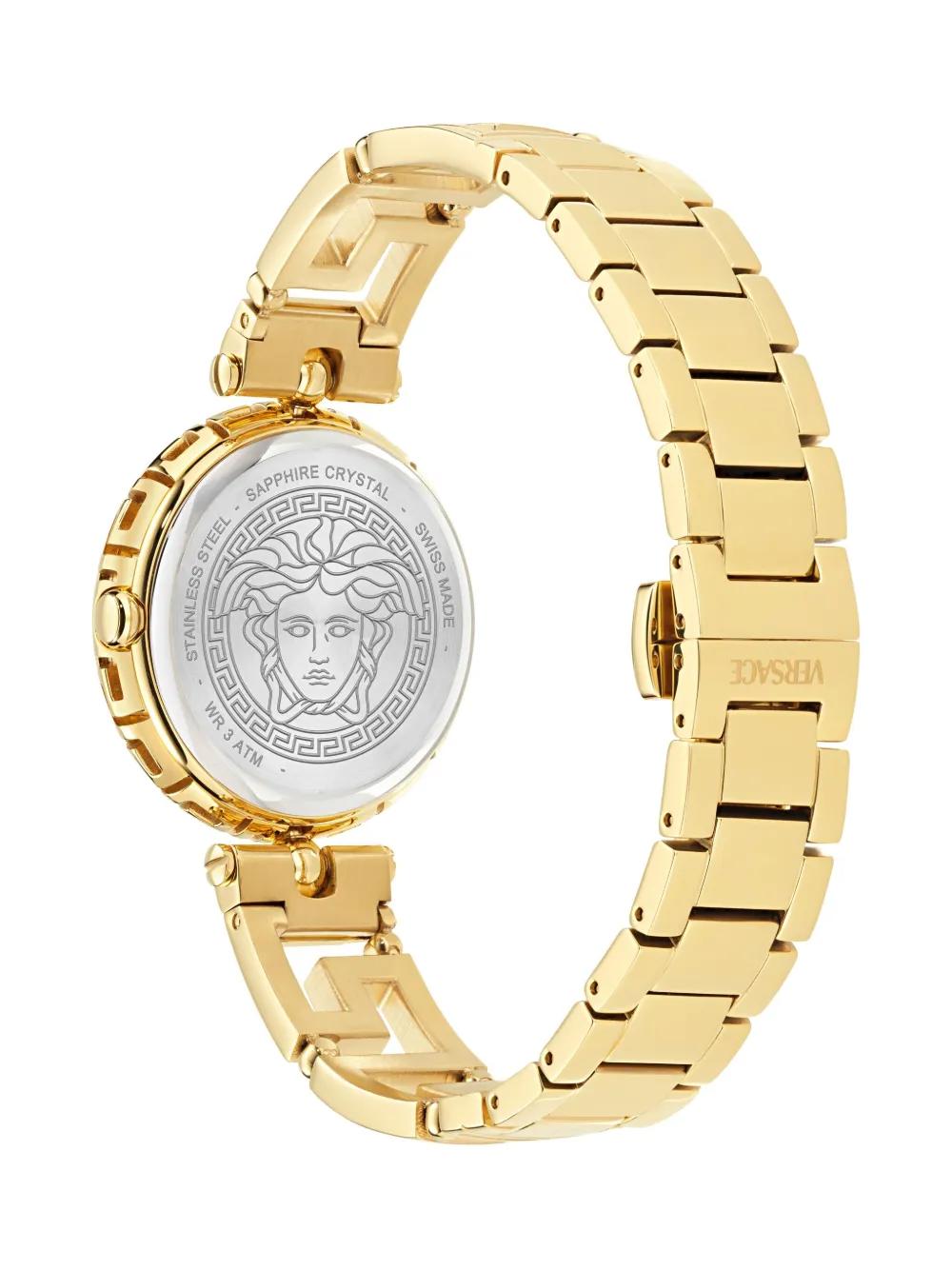 gold-tone 34mm round case shape medusa head dial feature quartz movement crown This item comes with a standard one-year warranty from the brand.