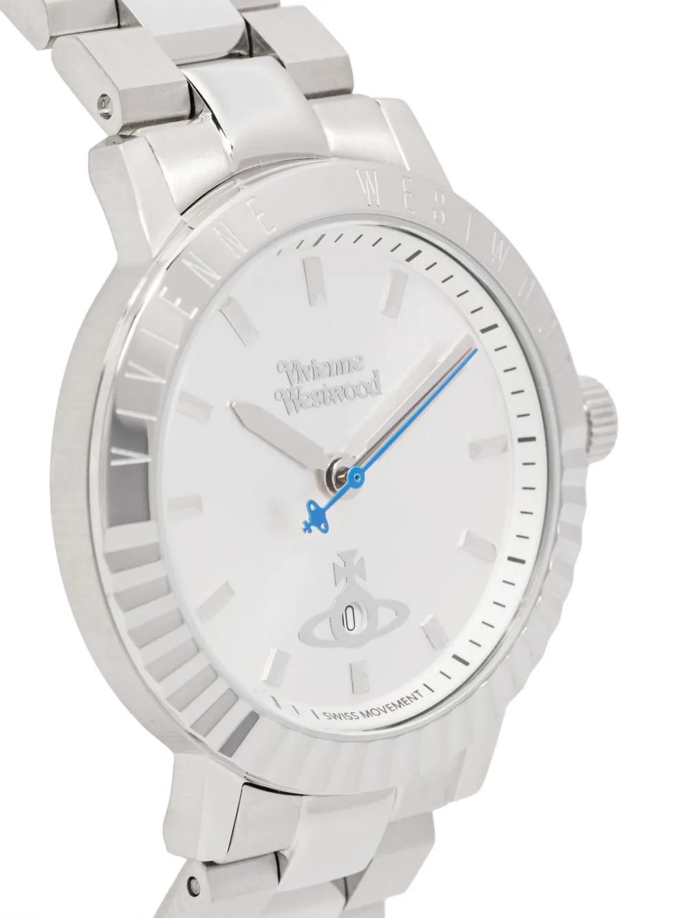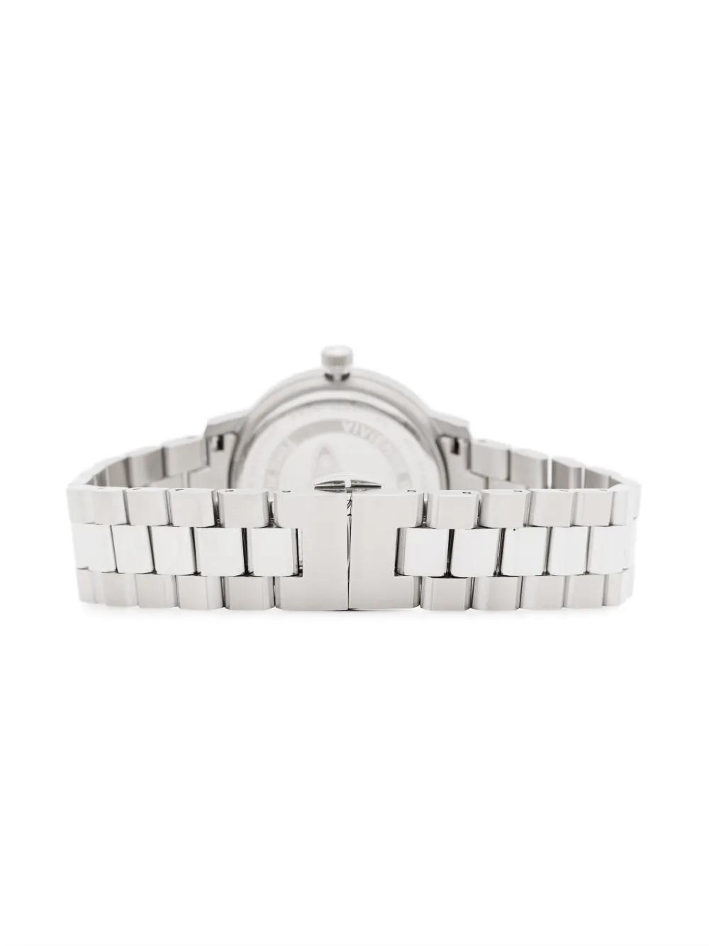 34mm stainless steel case quartz movement round face silver-tone index dial index hands fluted bezel logo-engraved bezel screw-down crown stainless steel link bracelet clasp fastening water resistance up to 50m/5 ATM This item comes with a standard one-year warranty from the boutique.