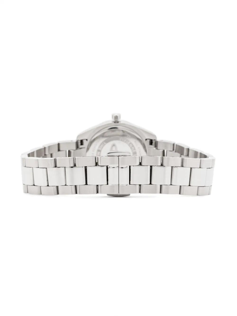 28mm stainless steel case quartz movement round face light pink index dial baton hands screw-down crown stainless steel link bracelet clasp fastening date indication water resistance up to 50m/5 ATM This item comes with a standard one-year warranty from the boutique.
