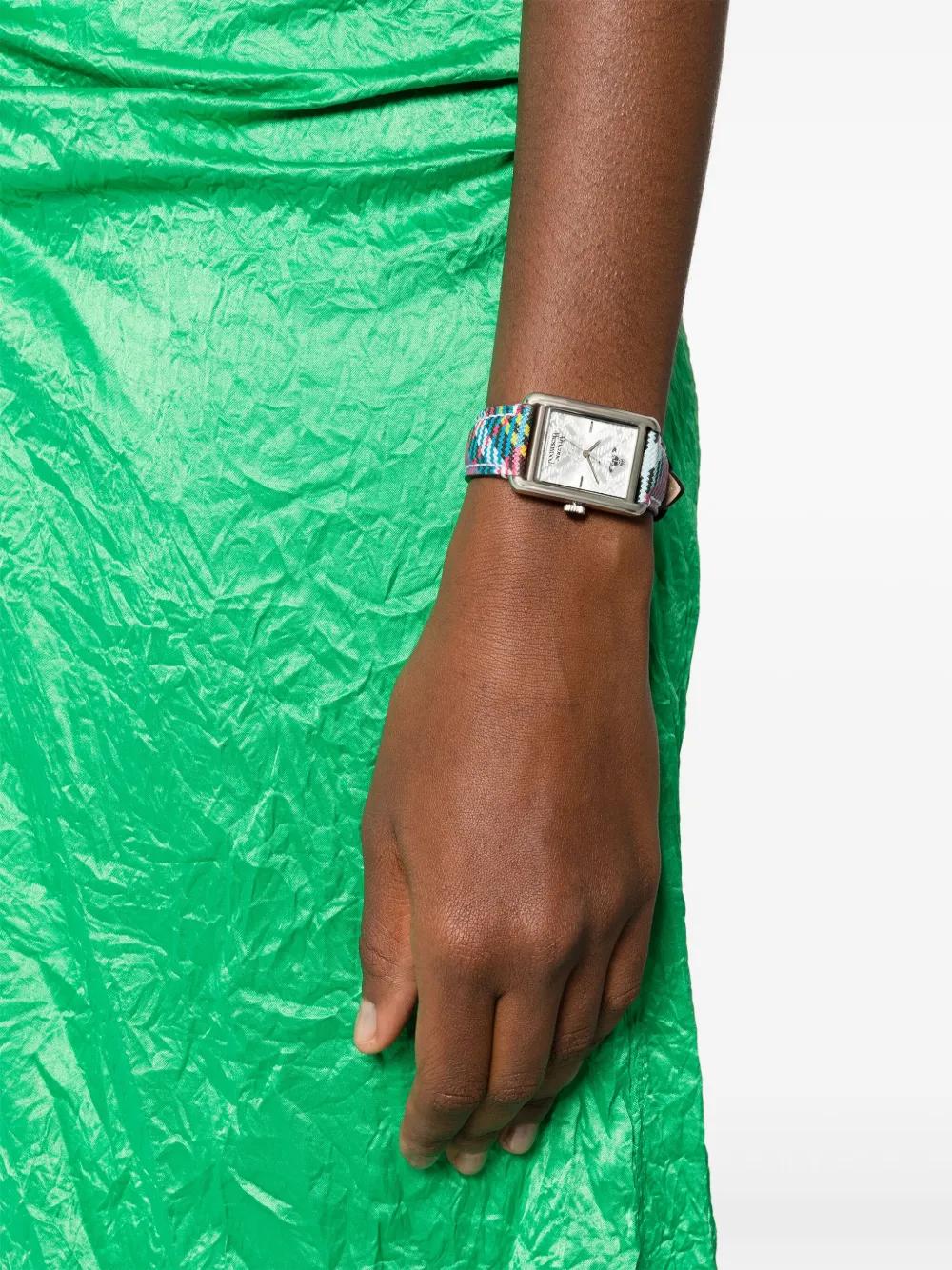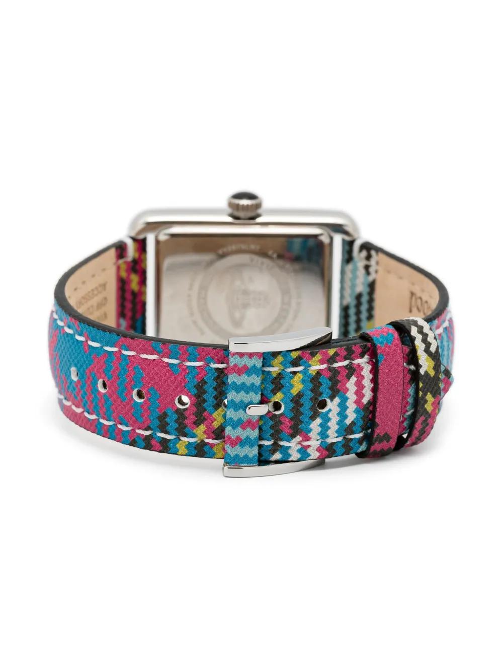 stainless steel quartz movement silver-tone baton dial baton hands signature Orb plaque detail square face screw-down crown engraved case back multicolour leather strap buckle fastening water resistance up to 50m/5 ATM This item comes with a standard one-year warranty from the brand.